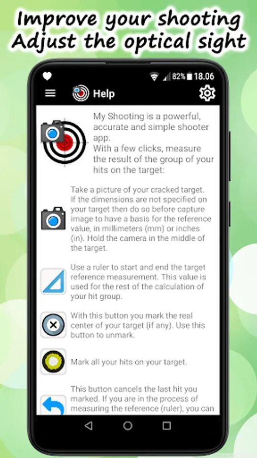 The main purpose of the application is to measure groups of hits, correct your shooting, save and share the results. With the app, you can easily track the progress of results and calibrate optical and other sights.