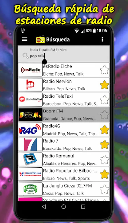 Search for radio stations by name, city, frequency and / or music genre through a detailed search.