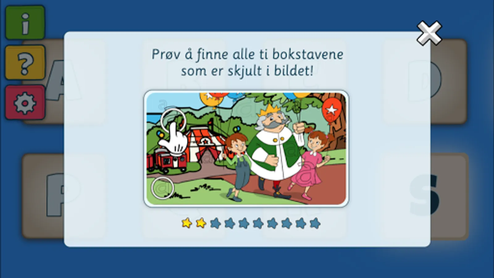 "Letters in the Image" is a great app for kids in early reading education. It provides good training in identifying letter shapes. The child should look for hidden letters in a picture. For each letter, there are three levels: lower case letters, upper case letters, and lower case letters. When you press the letter, you hear the letter sound. The app uses red vowels and blue consonants.