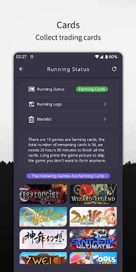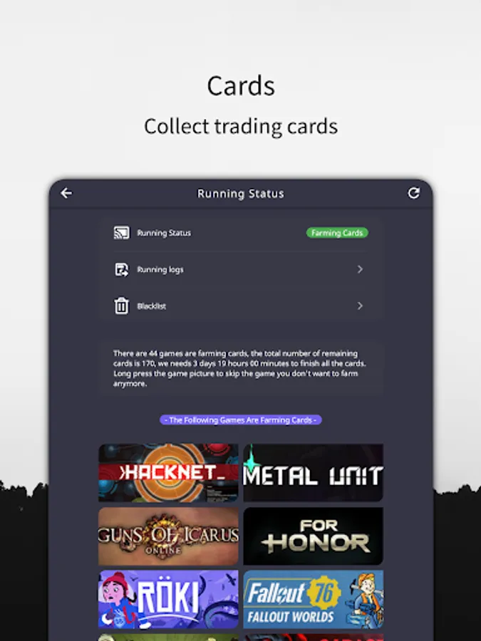 SteamX helps you easily collect your Steam trading cards through the cloud server. No need to run the app in the background.