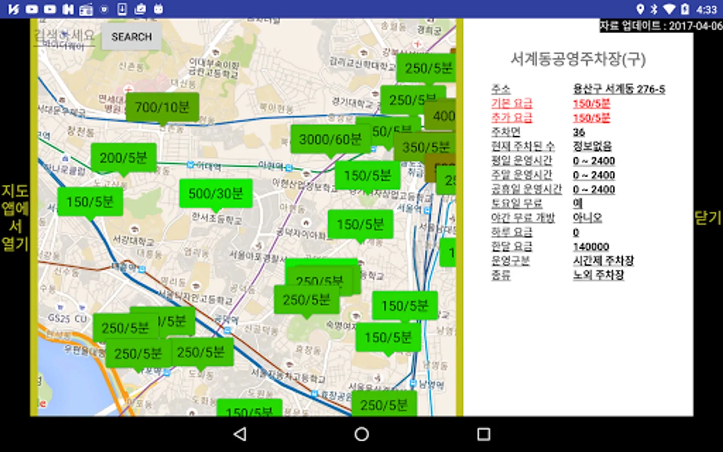 (If you can parking surface, the number of the current parking, opening hours and public holidays, Saturdays and weekdays, opening night) marker when clicked provides detailed information