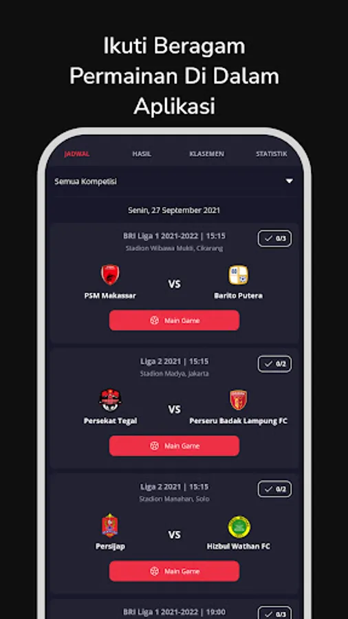 - Liga 1, Liga 2, Liga 3, and national teams.