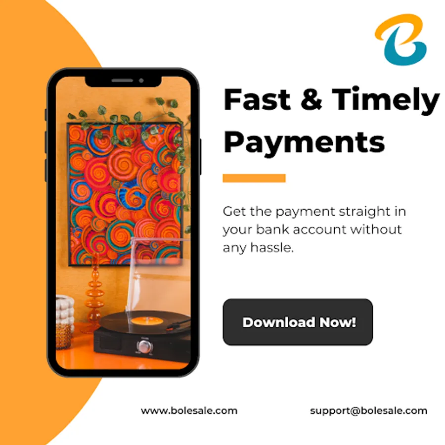Aaj he Bolesale par Seller baniye or keval apni Factory par dhyaan dijiye. Baaki sabhi tensions hume de dijiye. Hum aapke liye orders, logistics or payments sab manage karte hai. Aapke Orders ko aapki Factory se he pick kiya jaata hai or Payment seedha Bank Account mein, wo bhi bahut jaldi.