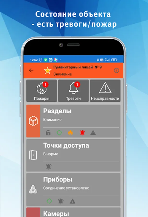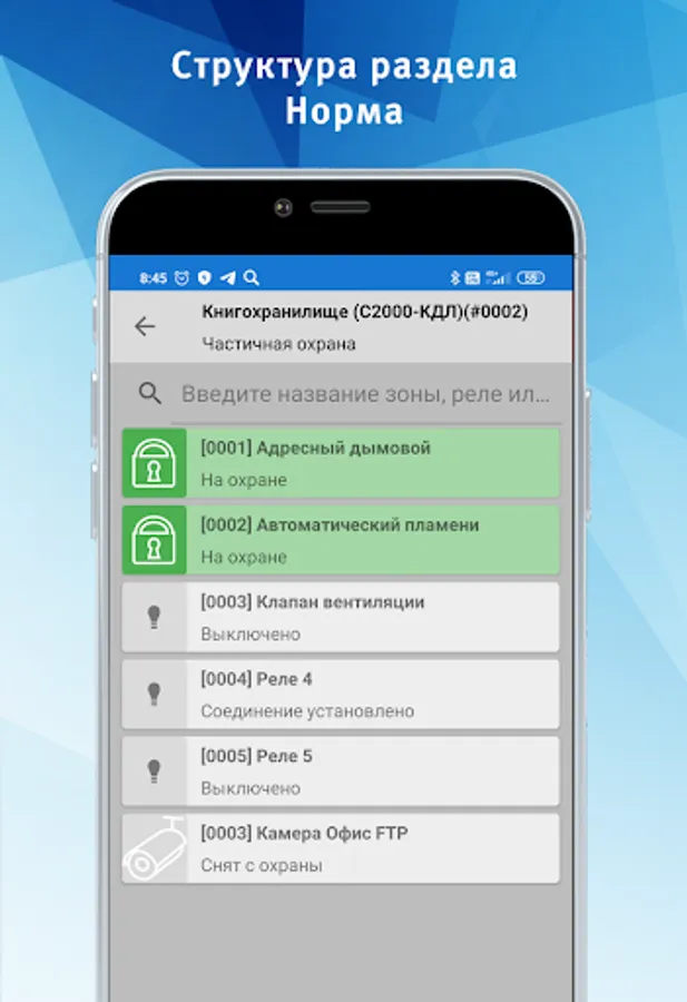 • Display of complete information on system elements (zones, relays, cameras, etc.);