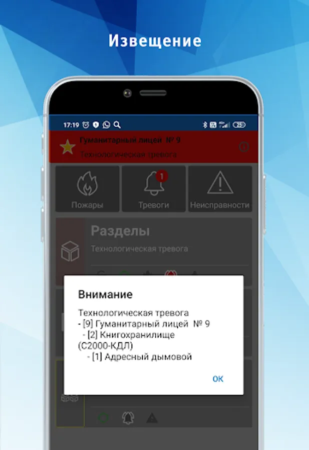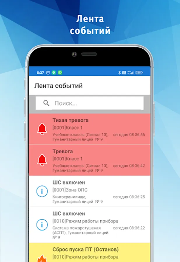 • Receiving and viewing a tape of events (fire, alarm, malfunction, etc.) on the object of protection with detailing to the zone, relay or device in real time;