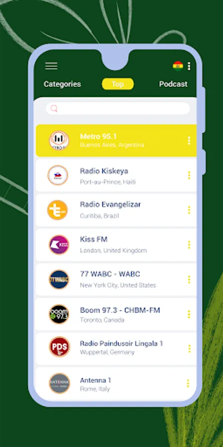 • ''World'' – listen to Android radio stations from all over the world.