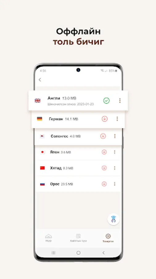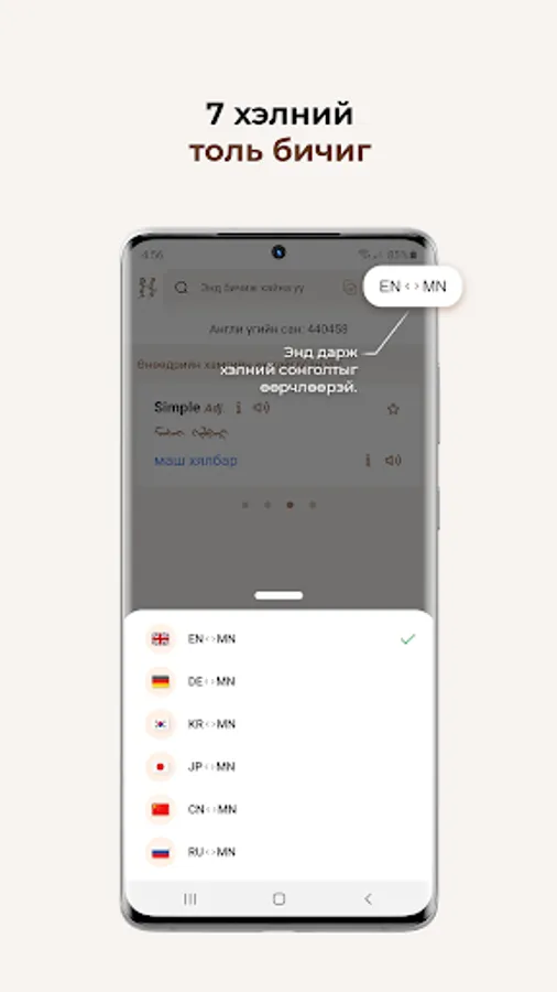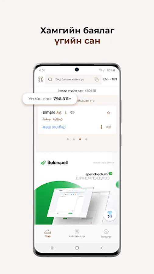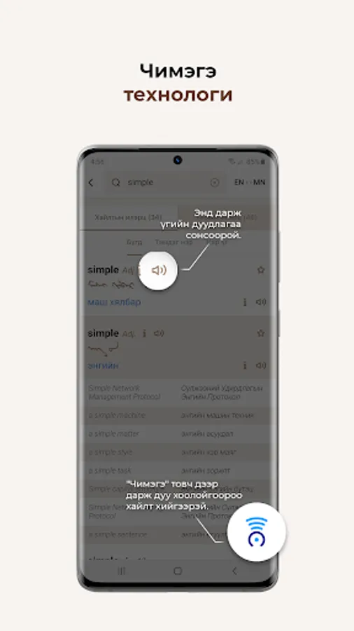 - Search by voice and listen pronunciations with the help of "Chimege" speech processing technology.