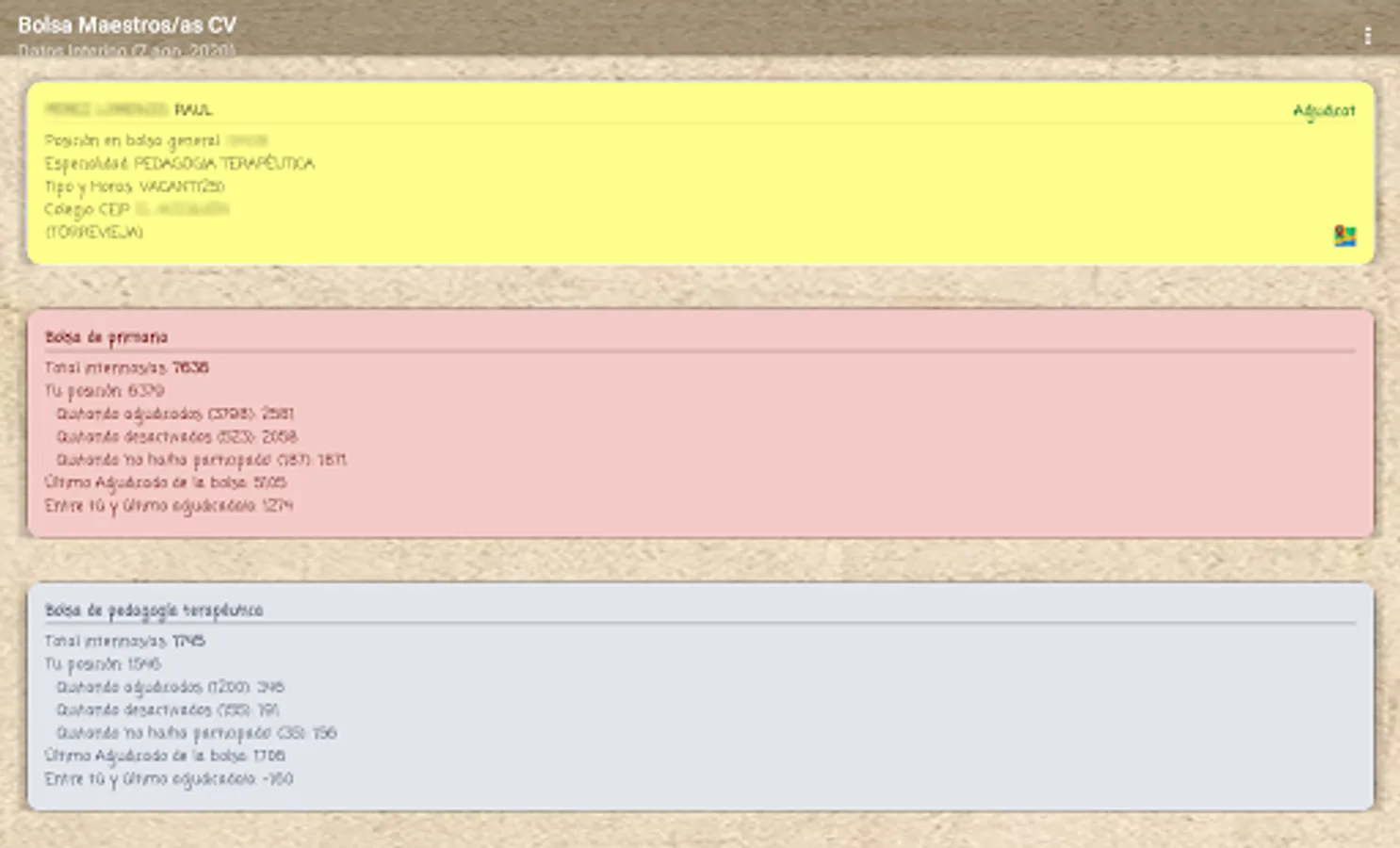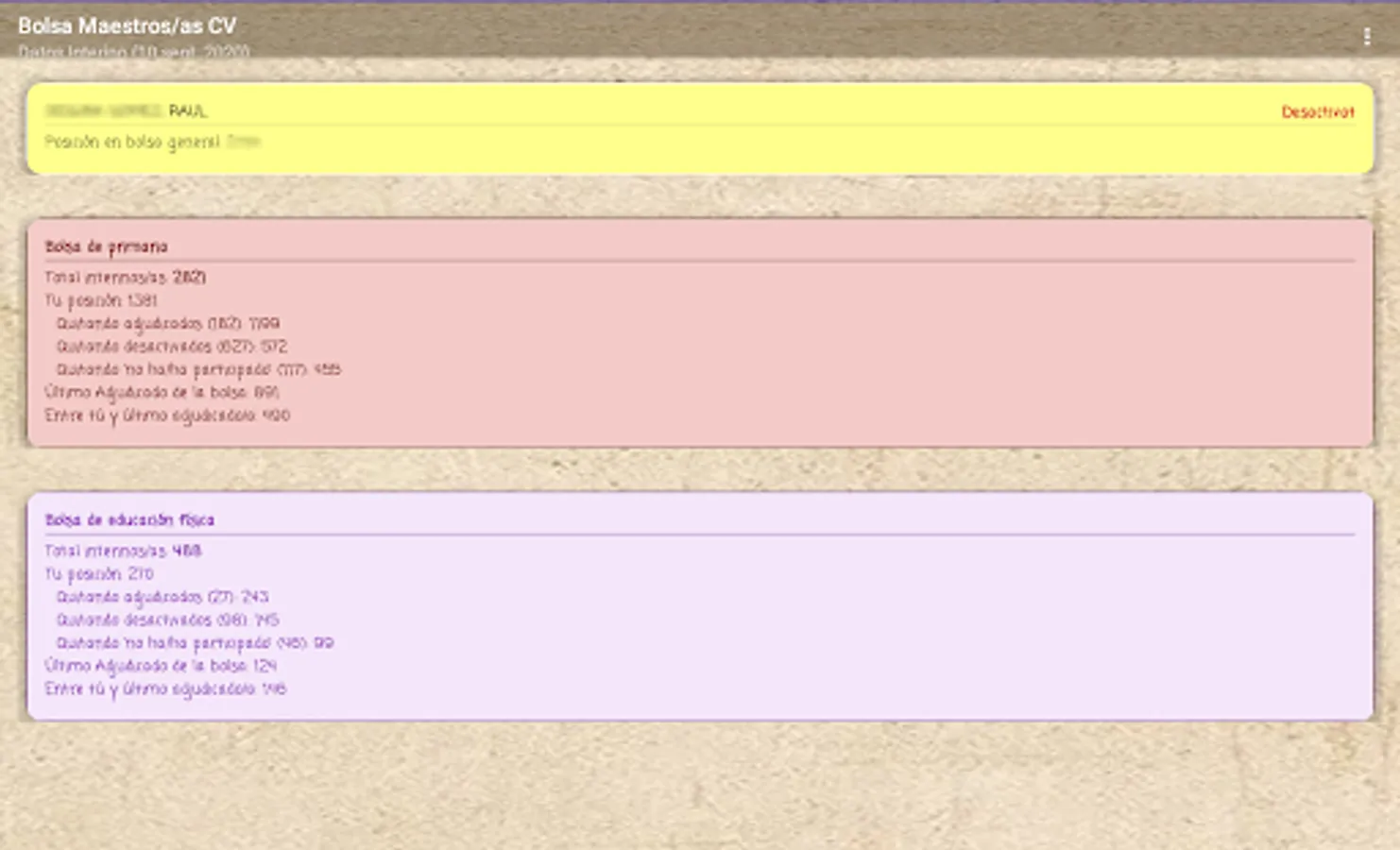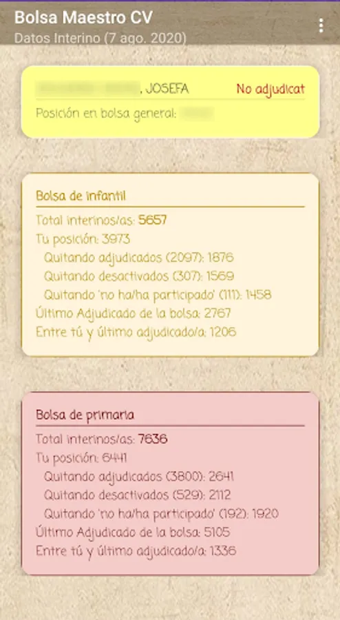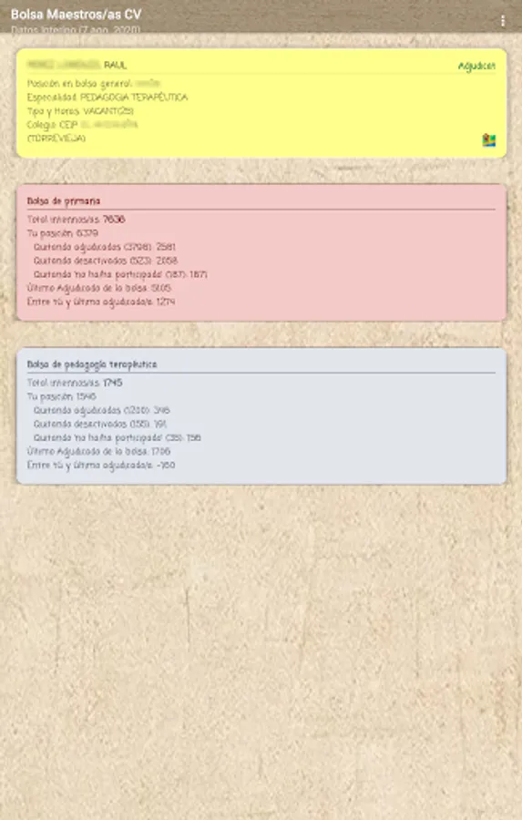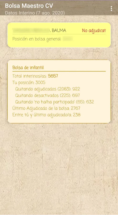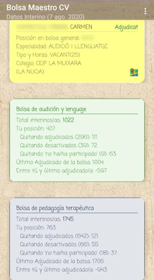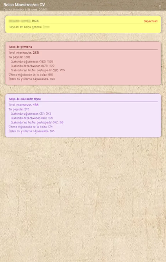 If you are an interim teacher in the Valencian Community, this application will allow you to know your real position in the stock market through data extraction according to the official lists published by the Conselleria, it is a private application without any connection with the Conselleria.