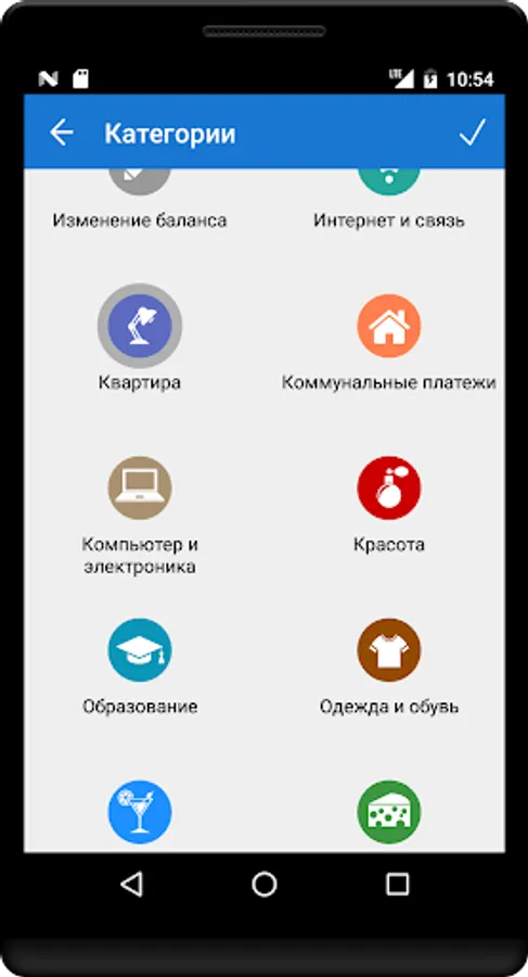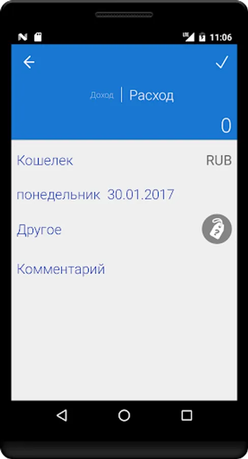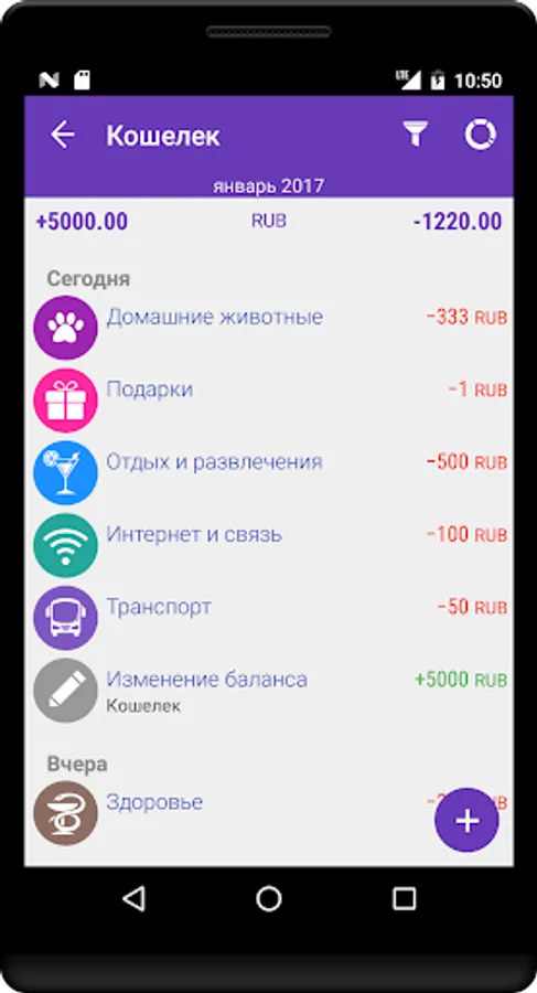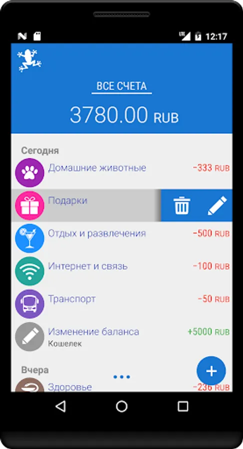 The main window contains a list of transactions for all accounts and for each account separately. two accounts in basic currency comes to start. Clicking on the balance amount in a particular account will introduce an initial amount on the remainder. You can create any number of accounts in any of the selected currency. The balances of all accounts are summed up on the page for all accounts to the base currency.