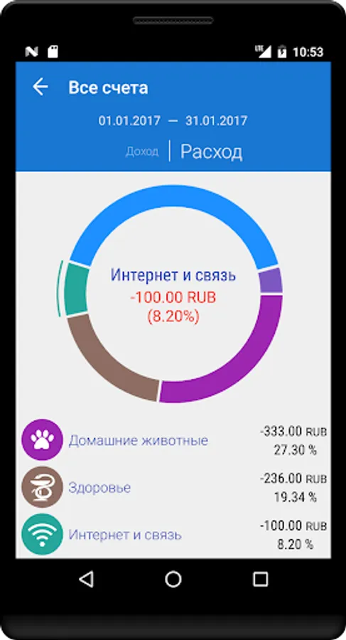 Three points at the bottom of the main window opens a page with a report for a certain period for a selected account. There is also a report on the income-expenditure in the form of a diagram.