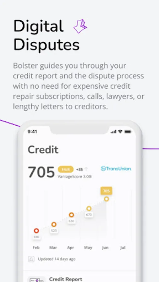 - Easy Credit Disputes: Bolster guides you through your credit report and the dispute process with no need for expensive credit repair subscriptions, calls, lawyers, or lengthy letters to creditors.