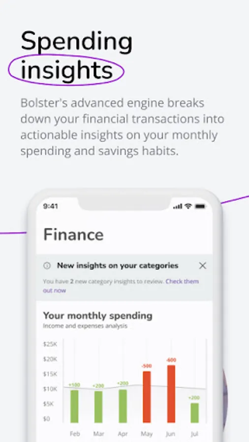 - Spending Insights: Bolster's advanced engine breaks down your financial transactions into actionable insights on your monthly spending and savings habits.