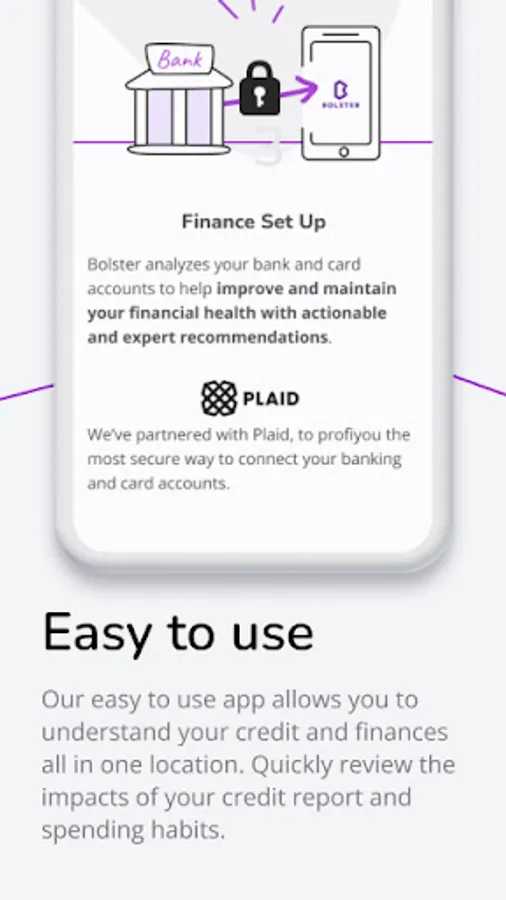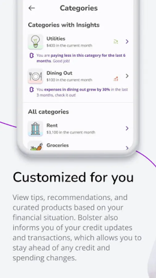 - Customized for you: View tips, recommendations, and curated products based on your financial situation. Bolster also informs you of your credit updates and transactions, which allow you to stay ahead of any credit and spending changes.