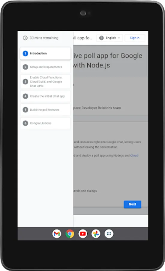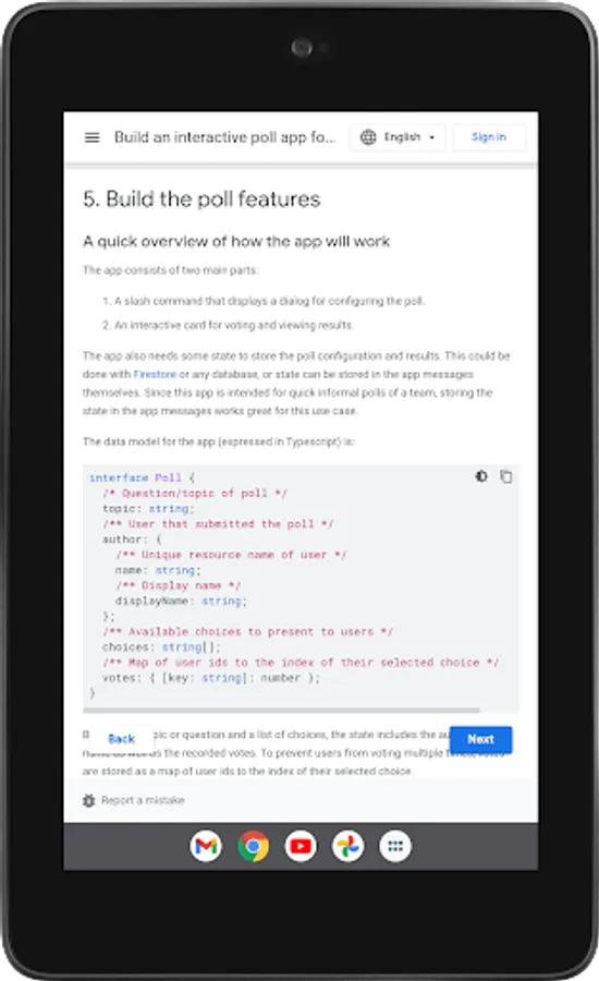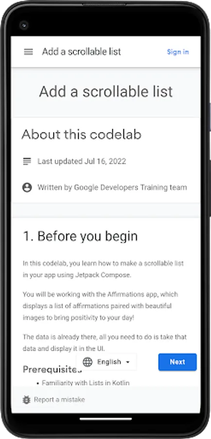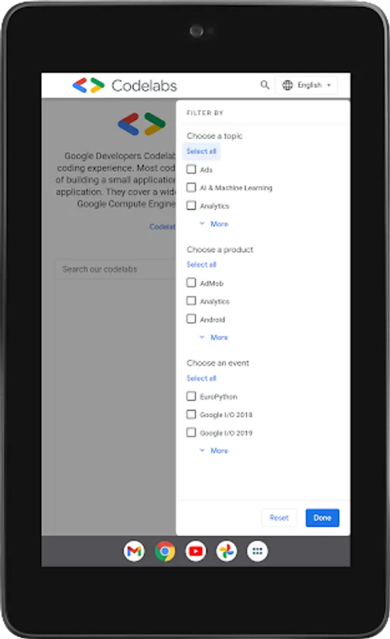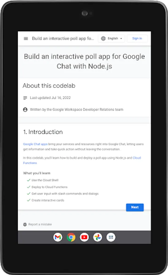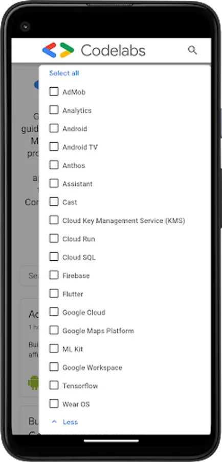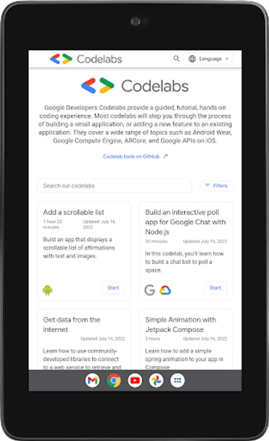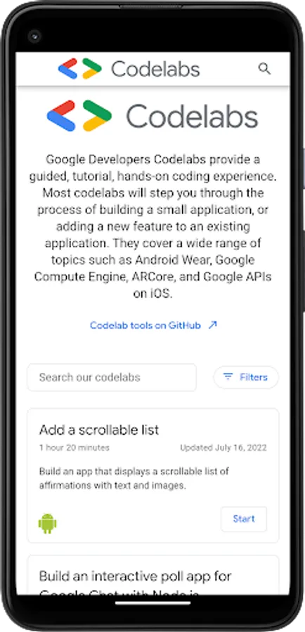 Codelabs: Build anything that provides a guided, tutorial, hands-on coding experience. Most codelabs will step you through the process of building a small application or adding a new feature to an existing application. They cover a wide range of topics such as Android Wear, G Compute Engine, ARCore, and G APIs on iOS.