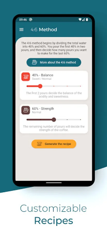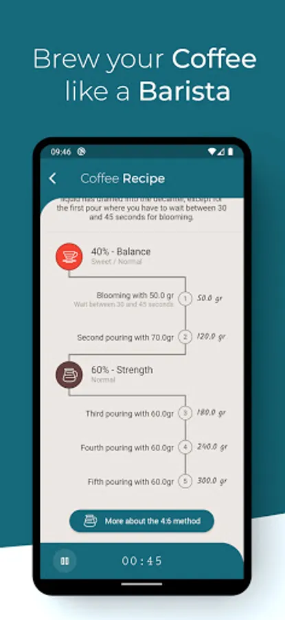 The application generates for you a recipe according to your desires, define the coffee you want, the strength, the quantity, follow the recipe and enjoy.