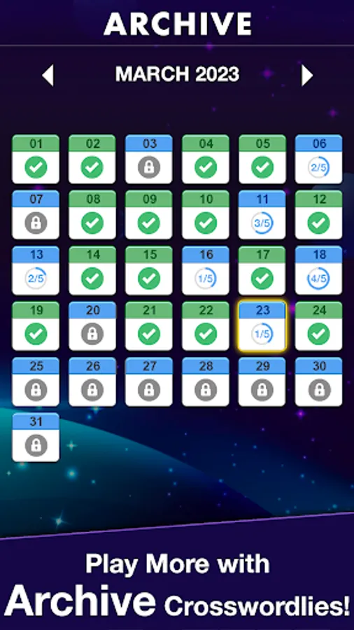If you miss a puzzle or just want to test your memory, play Archives to play older puzzles. We have the entire collection of the puzzles so you don't miss out on your Crosswordly EVER!.
