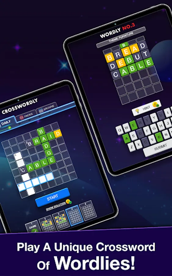 A combination of Classic Crosswords and the Viral game Wordle, we are here to make you guess and win! Solve a unique competition everyday, mastering and have fun while you crack puzzles and become a master of cross-words! Connect common letters, continue guessing and find entertaining mini clues while you quiz yourself and crack the puzzle. Here is what the game is all about: A crossword is a word puzzle that takes the form of a square grid with black and white squares, the aim of the game is to fill the white squares with the correct letters. Our game takes you to an entirely new way of entertainment with crosswords where to crack a word you solve a Wordle! Click on start buttons or enter a word via the grid, enter your guess for that word and watch the color clue reveal how close you are to mastering the puzzle! A correct letter in the correct place will turn the tile green and a wrong letter which is not in the word will turn the tile grey and a correct letter in an incorrect space will turn the tile yellow. Crack and connect 5 such wordles and you solve your daily crosswordly!