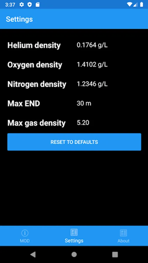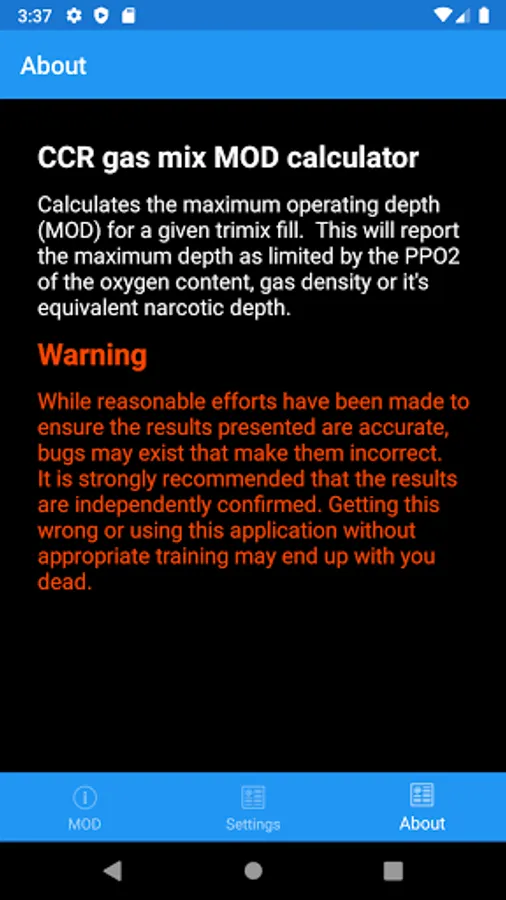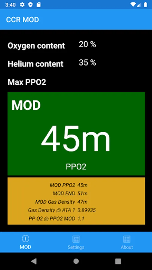 Calculates the maximum operating depth (MOD) for a given trimix fill. This will report the maximum depth as limited by the PPO2 of the oxygen content, gas density or it's equivalent narcotic depth.