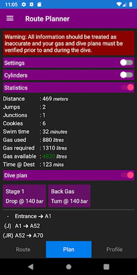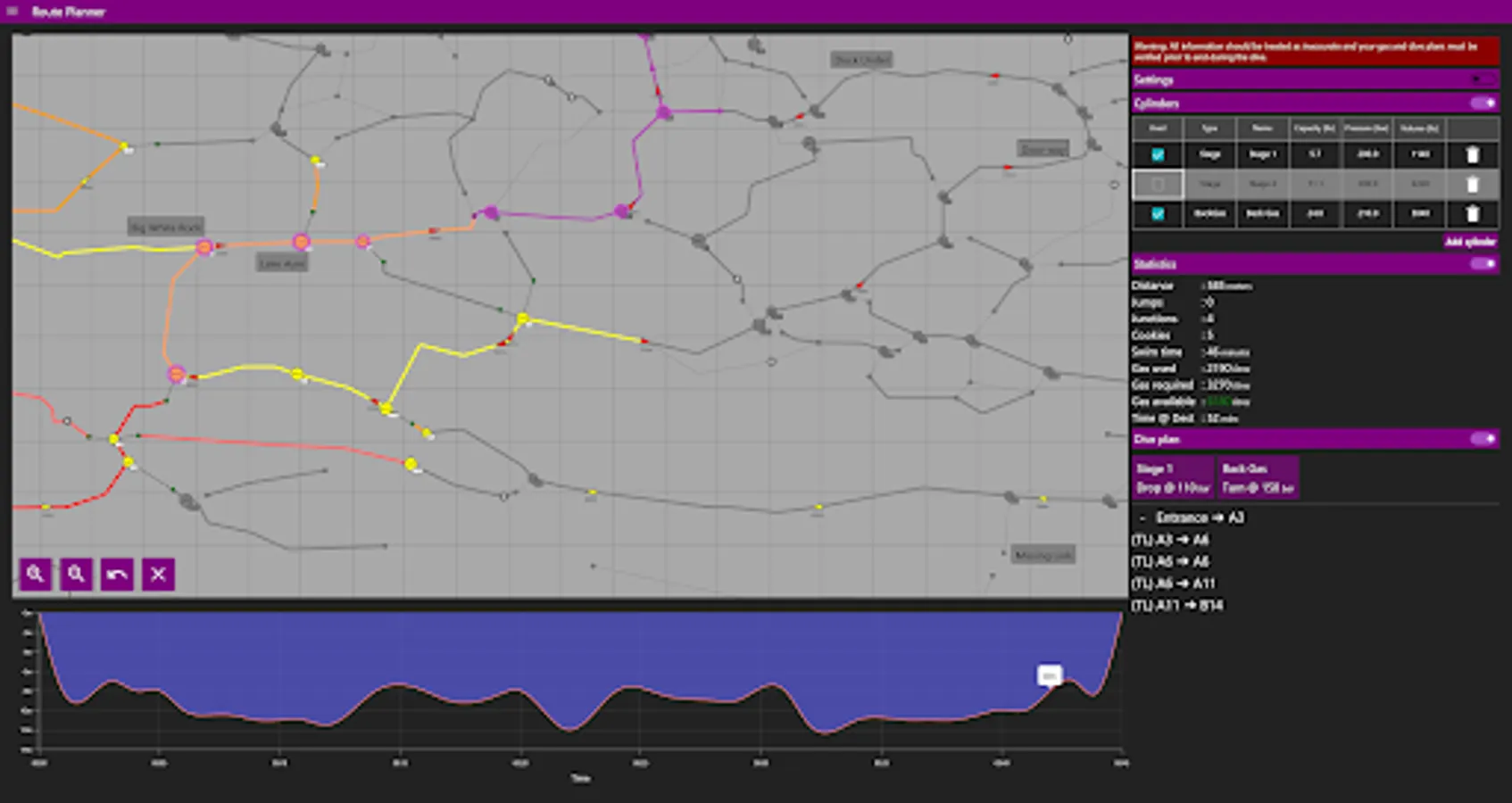 Cave diving can include some complex navigation and planning that is normally done solely by hand and is not easily verifiable. Tank cave in South Australia is such a cave that includes complex navigation and potentially stage cylinders to reach the areas you want to go to. Bombimi Cave lets you view a schematic of the entire system that includes jumps and tags and select the route you intend to take. It will then give you instructions for your dive slate and how many cookies and jump reels you will need conduct the dive. You can also give it information about your cylinder configuration, and it will give you estimates of air usage and available time. As mentioned above these are all estimates and should be sanity checked for errors introduced by bugs or cave changes. Always apply common sense and verify where possible.