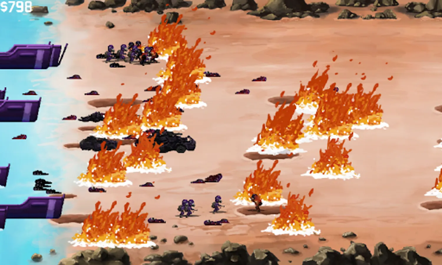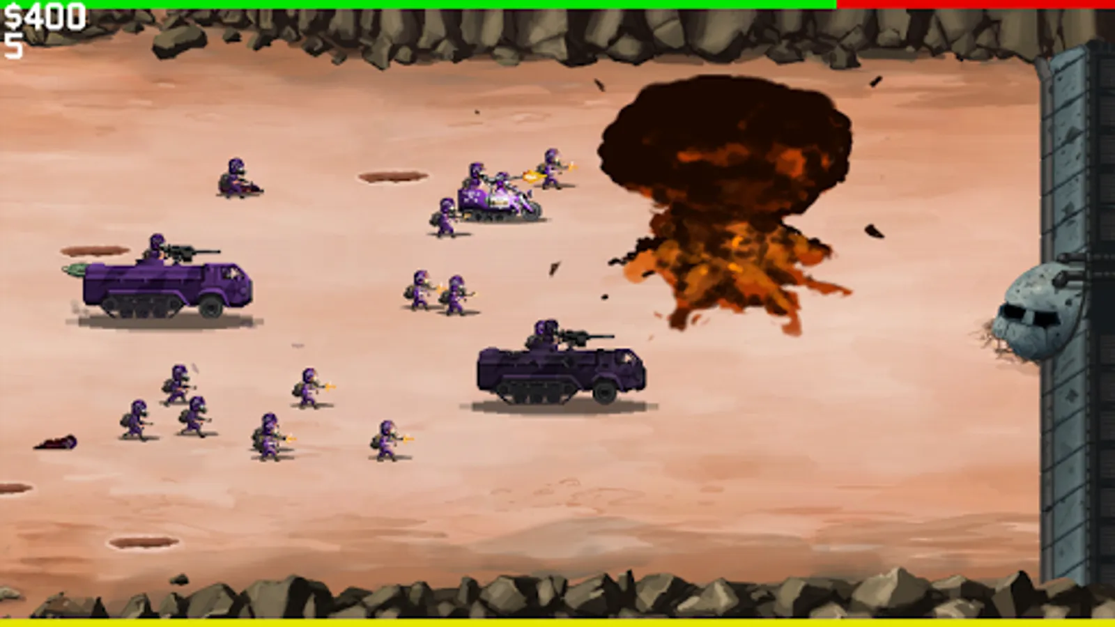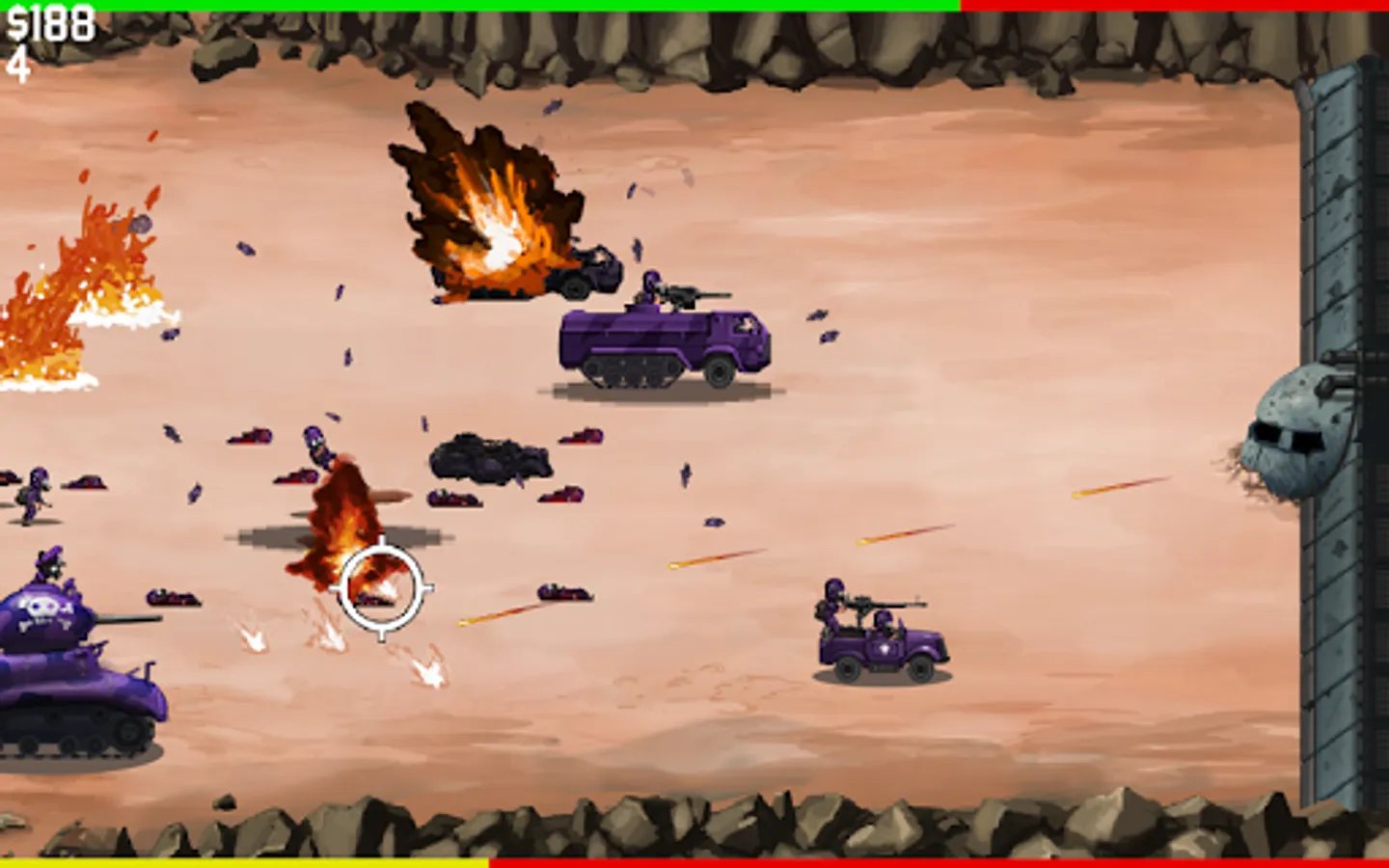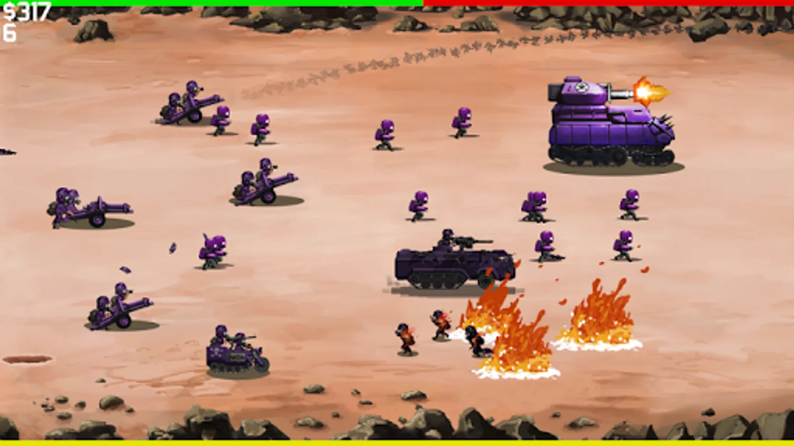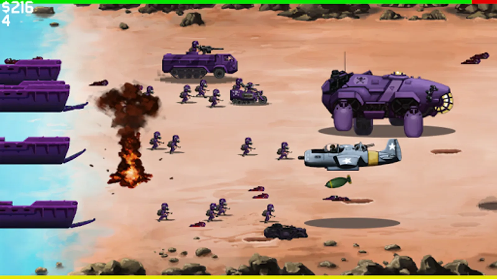 Use machine guns, artillery, and powerups to fight off an endless stream of enemies! Upgrade your equipment and use airstrikes, napalm, land mines, and more to dominate the battlefield! No pay-to-win, no always-online internet connection. Just pick up and play!