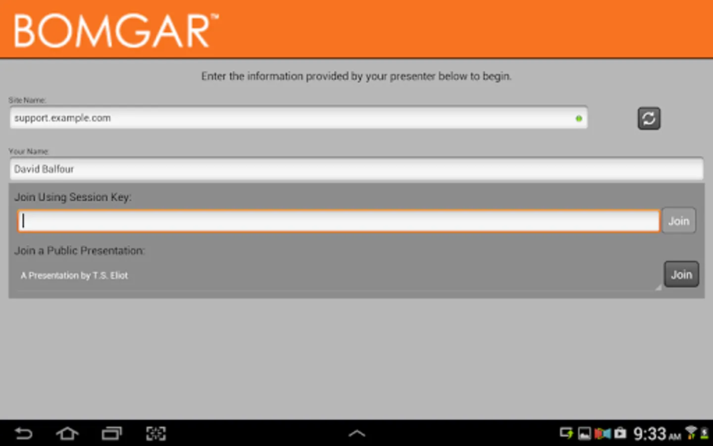 With the Bomgar Presentation Attendee Client, you can quickly and easily join a Bomgar presentation from anywhere, anytime. No access to a computer with a desktop OS is needed to join a presentation allowing employees, partners, or customers to more easily collaborate and present.