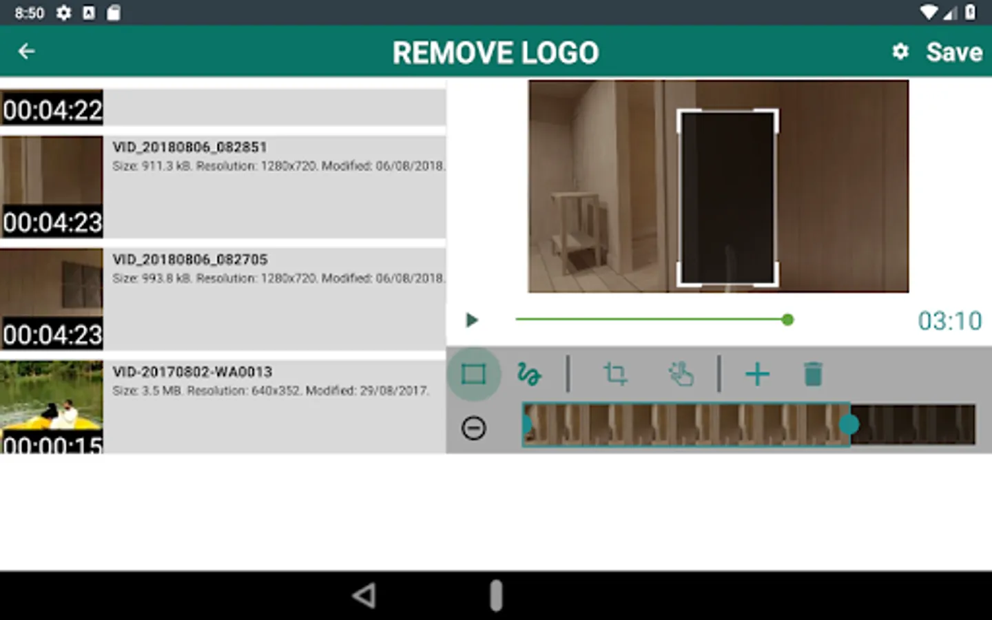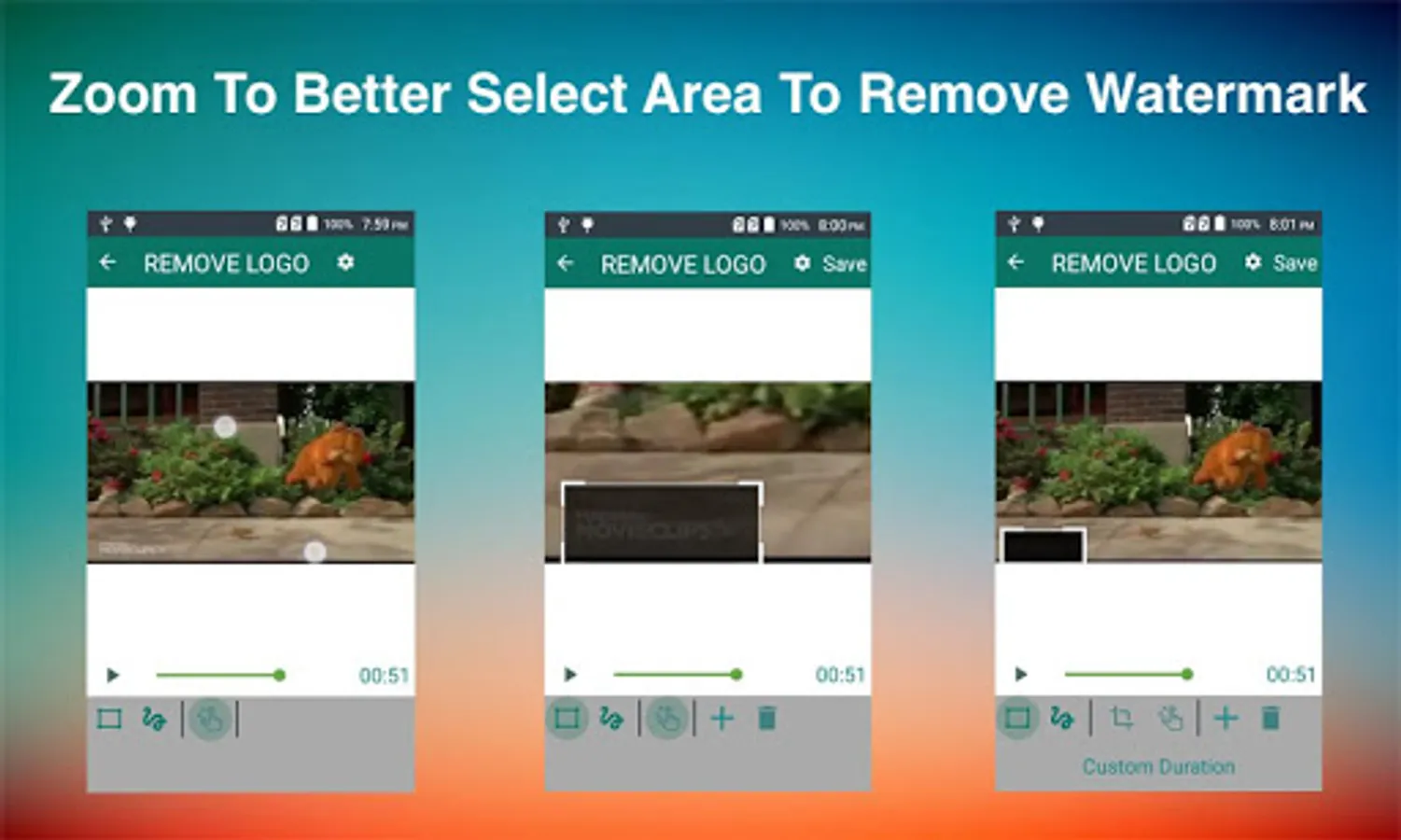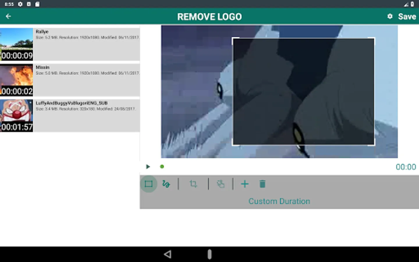 ✔If you select REMOVE LOGO option then you are taken to screen with preview and adjustable rectangle with actions(specify more than 1 areas) to specify the area of logo, in this screen can also click on Custom Duration button to specify duration for which to apply filter.You can also choose zoom option and pinch with fingers to better select small watermark area.