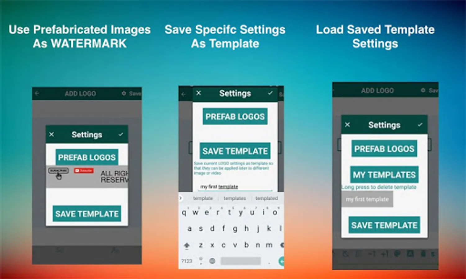 ✔ You can also use prefabricated images as watermarks or can save your specific settings as template, these templates can be applied to a different image or video later using 'saved template' option.