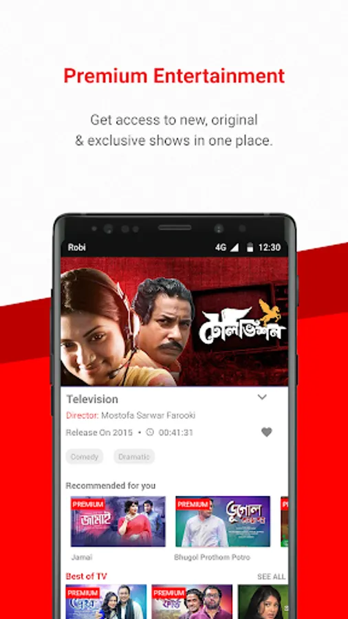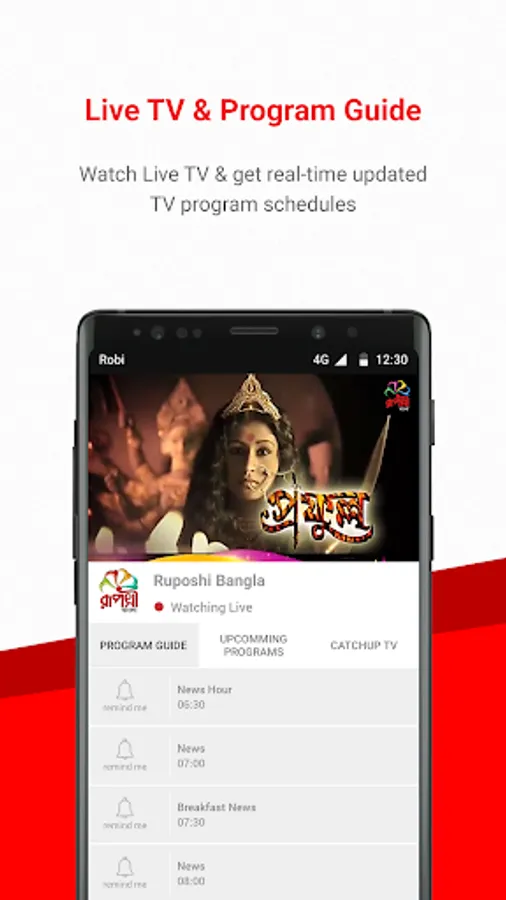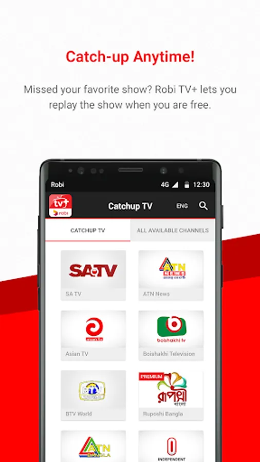 1. Watch live TV channels at your convenience with catch up facility. If you miss or remain busy during your favourite show, watch it later on Robi TV+. (within 24 hours, on Independent Television, Probashi Bangla TV, Boishakhi, and Ekattor channels only)