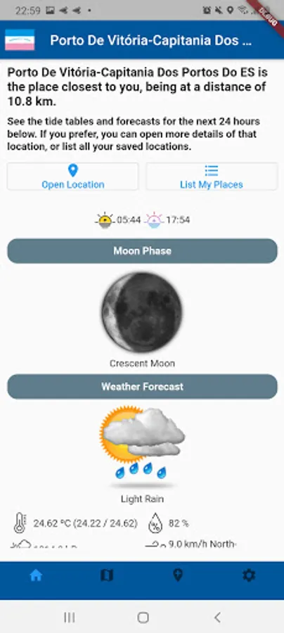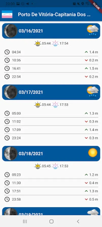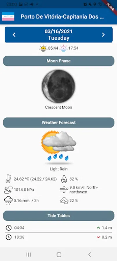 Consult tide tables, taken from the Brazilian Navy, whenever you need them. In addition to the tide see also the moon phase, sunrise and sunset times and the next 5 days weather forecast. You can also consult forecasts on the map, making it easier to find the best measurements.
