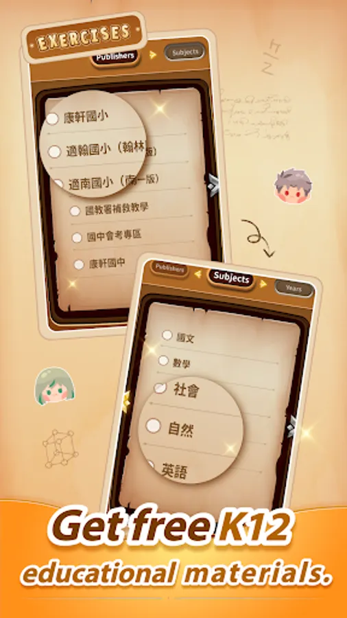 Provide Taiwanese K12 students with free, latest educational materials from 5 subjects (Chinese, English, Mathematics, Social Studies, Science) to answer question and practice!
