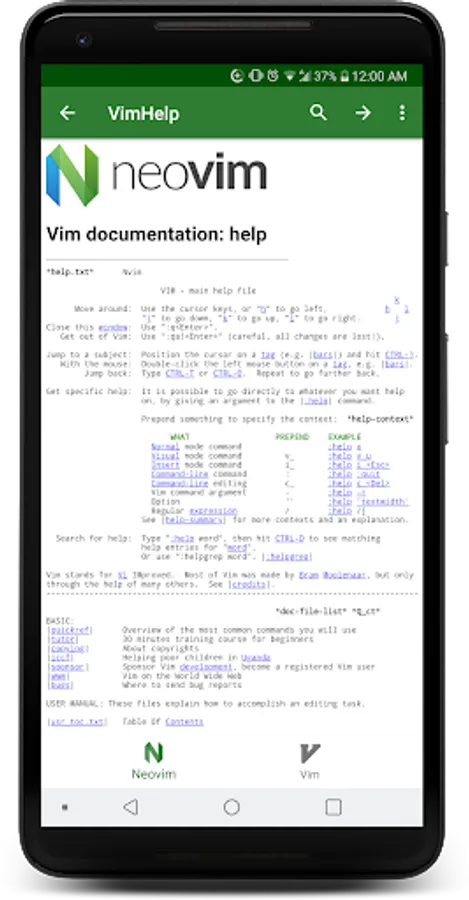 Browse through Neovim and Vim help docs offline. Easily jump from one location to another using the help tags. As well, you can move backwards and forwards through jump list in true vim style. Lastly, in you don't know exactly where you want to go, try the fuzzy search time find the exact help doc you are looking for.