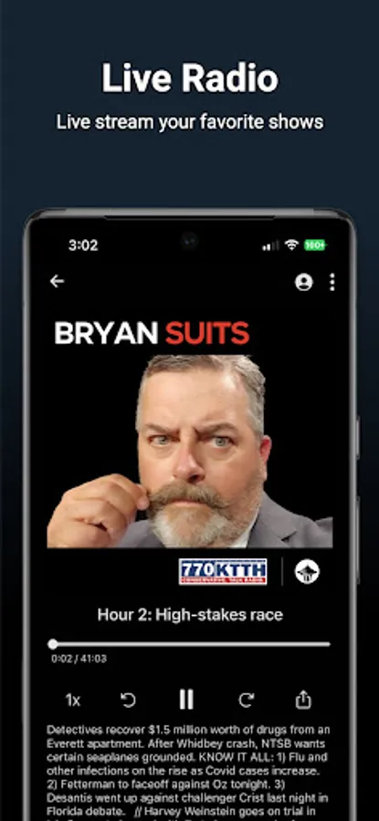 Your favorite KTTH talk shows live and on-demand in the palm of your hand: Bryan Suits, Dan Bongino, Michael Medved, Jason Rantz, Ben Shapiro, Michael Knowles, Mark Levin, and Guy Benson. Listen for free, anytime of day with crystal clear audio quality.
