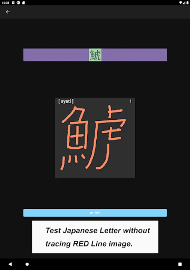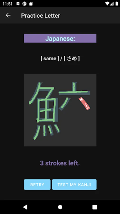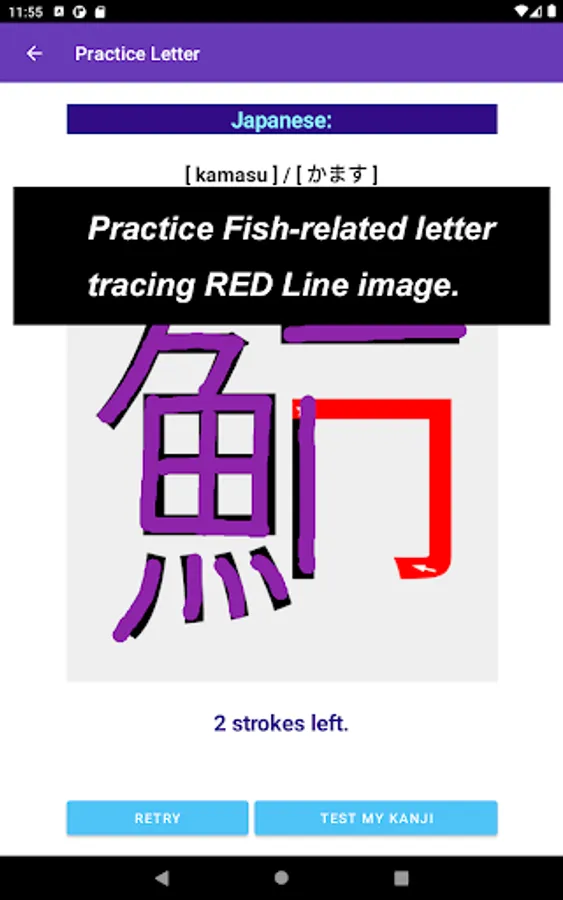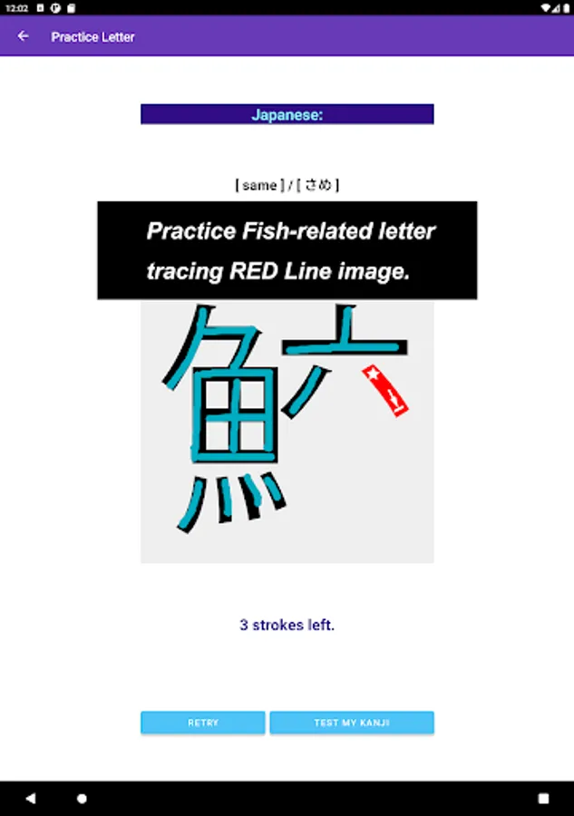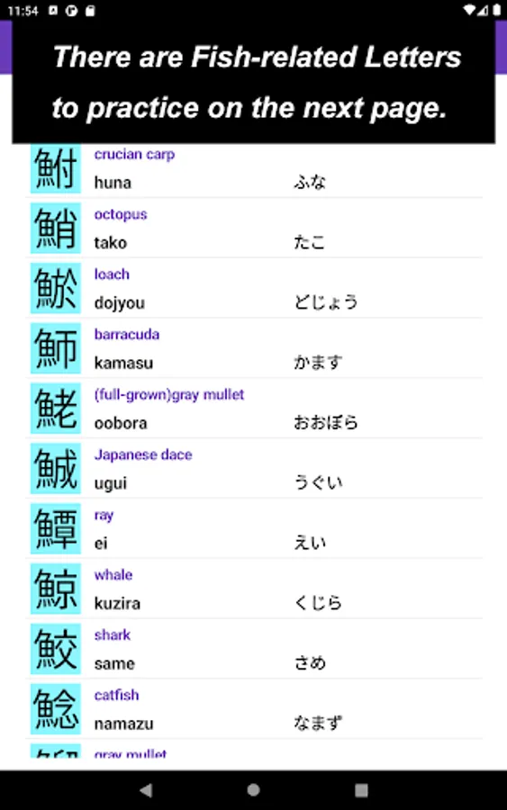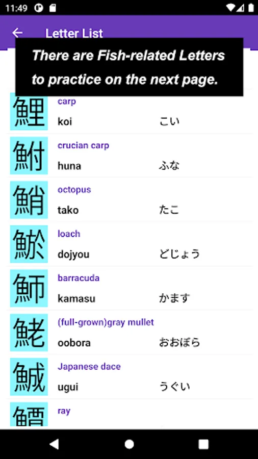 The app also focuses on a single Kanji letter. All letters that you practice on JP Fish app mean fish though; at this time, some letters mean marine mammals, such as whale and killer whale.
