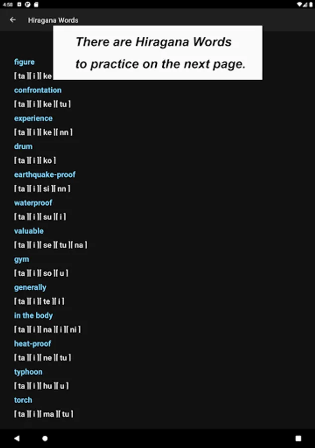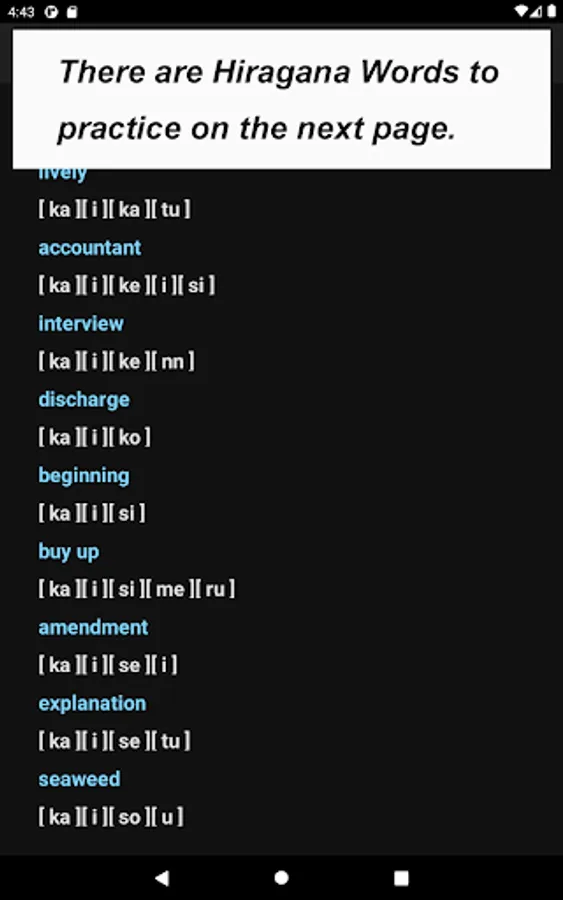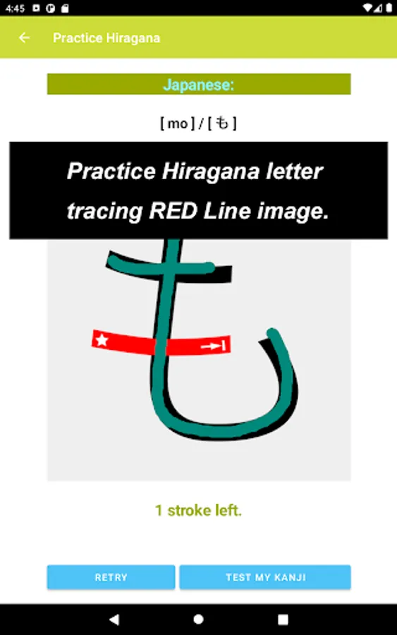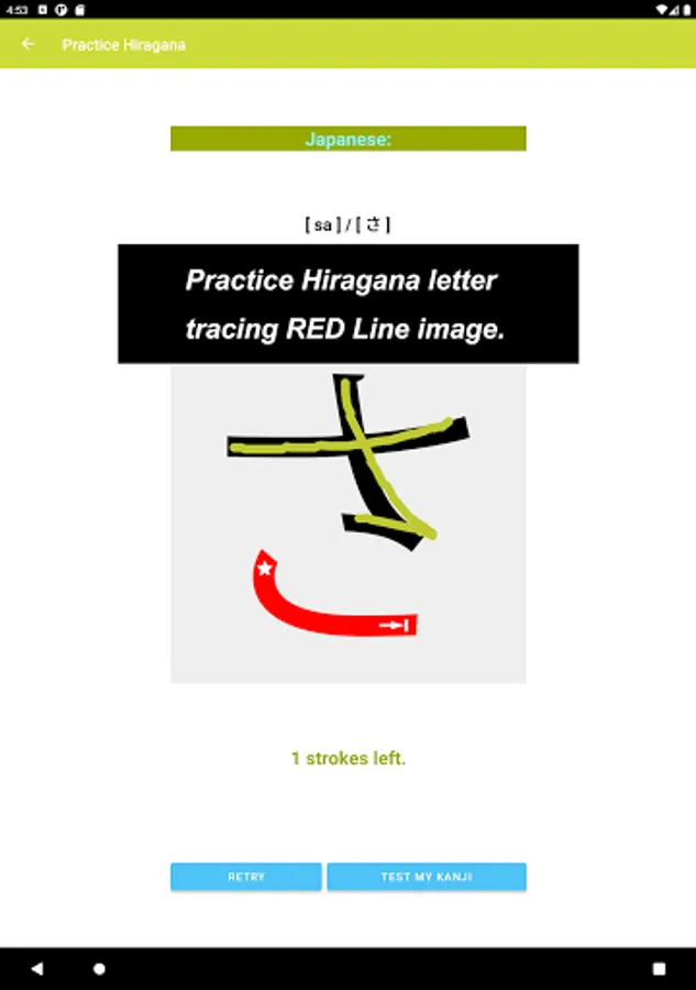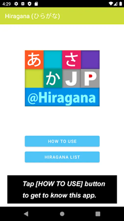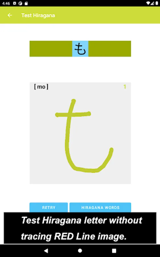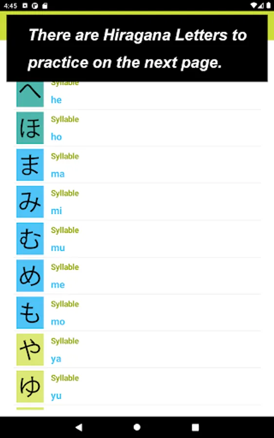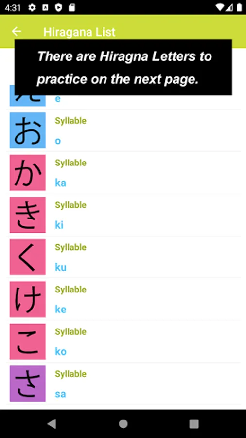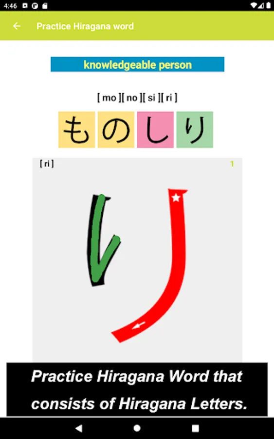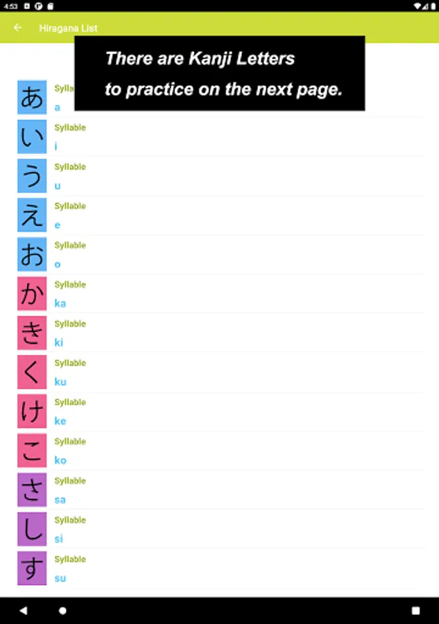 What you would see in this app is a list of Hiragana letters. If you tap one of those letters, you can practice how to draw its letter.