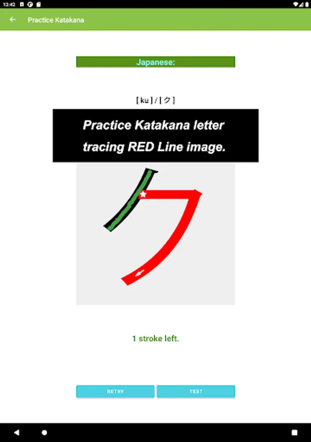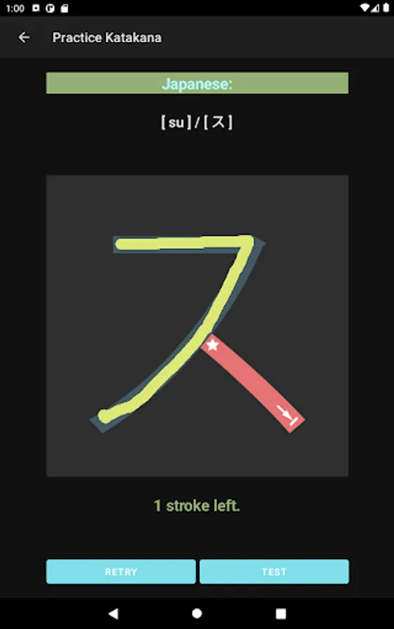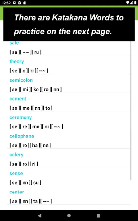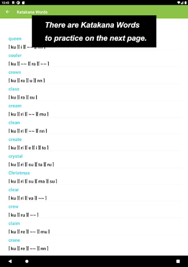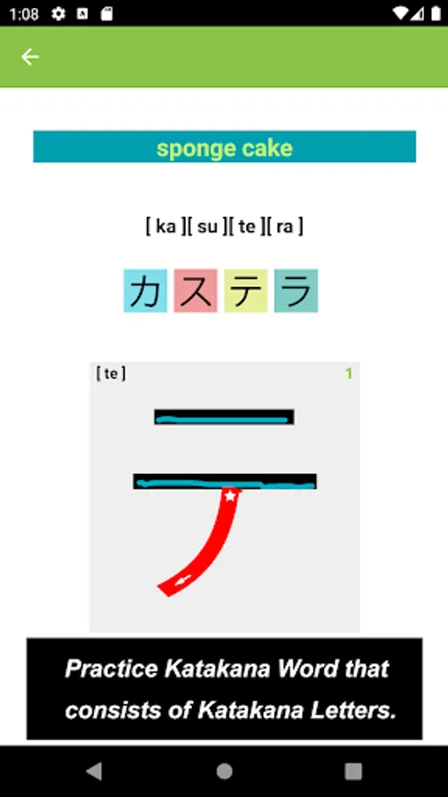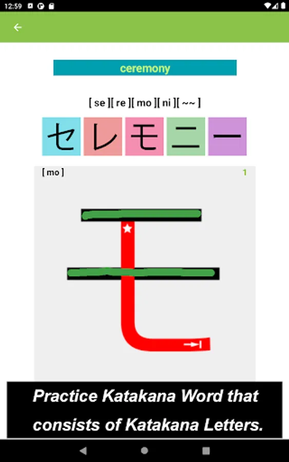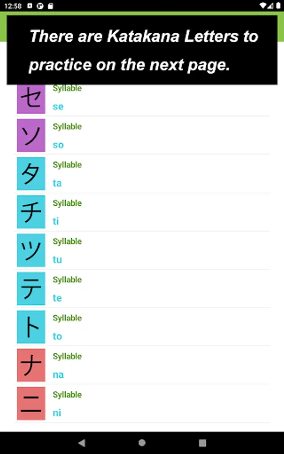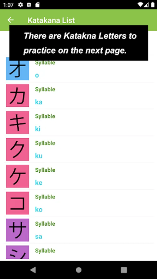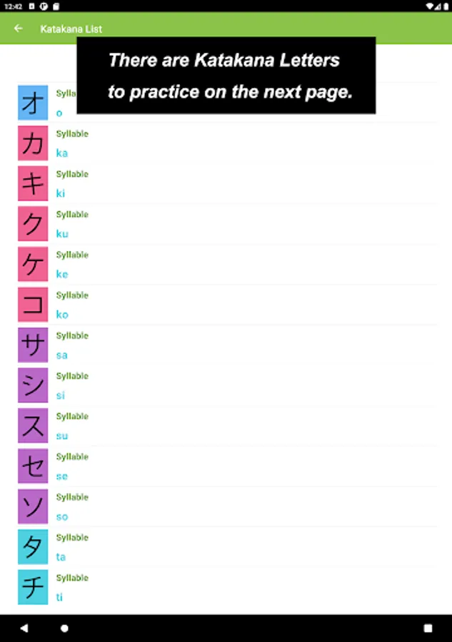 What you would see in this app is a list of Katakana letters. If you tap one of those letters, you can practice how to draw its letter.
