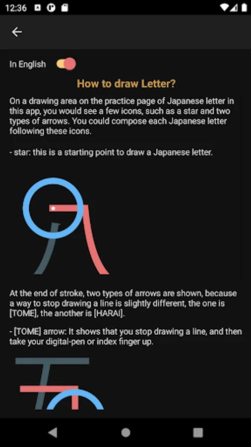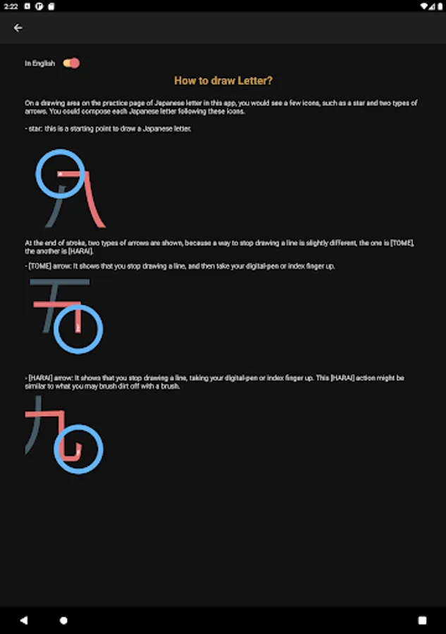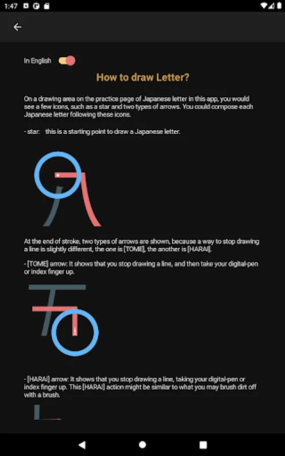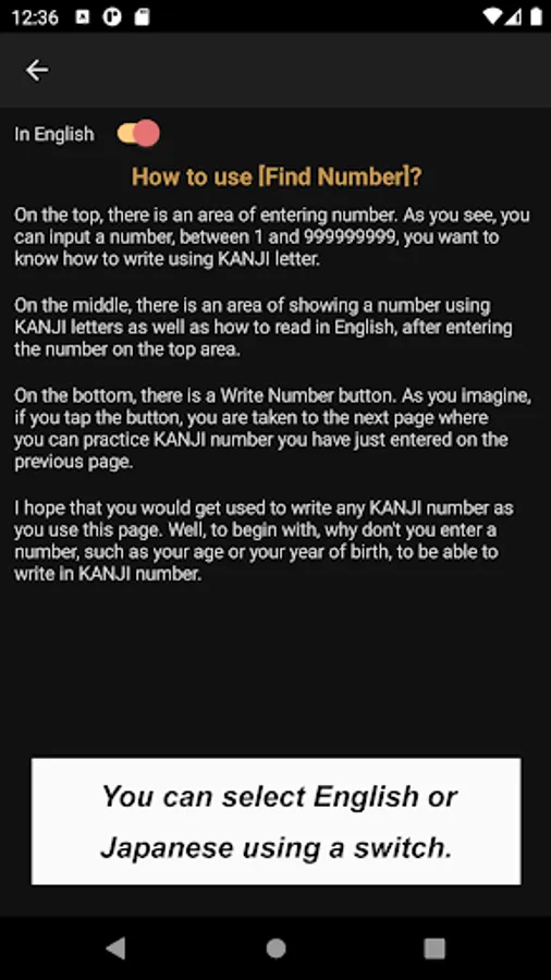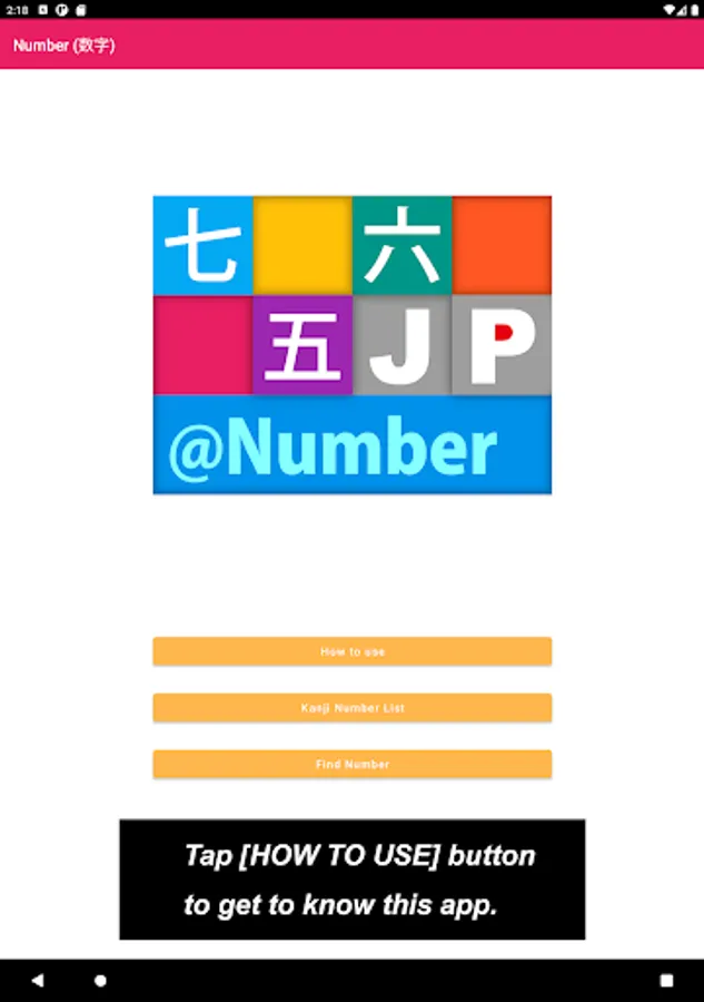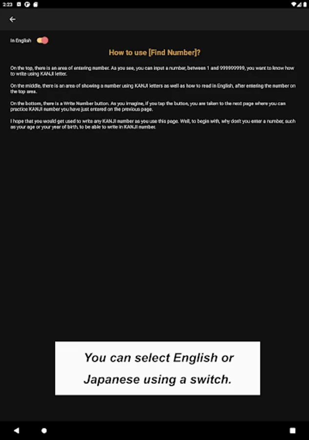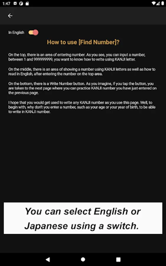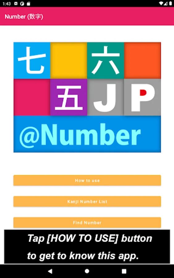 In the "How to use" section, the first thing to be seen when you tap [How to use] button is a list of buttons to explain the app, such as [How to draw Kanji letter?], [How to pronounce Kanji letter?], [How to build Kanji number?], [How to use FIND NUMBER button] etc.