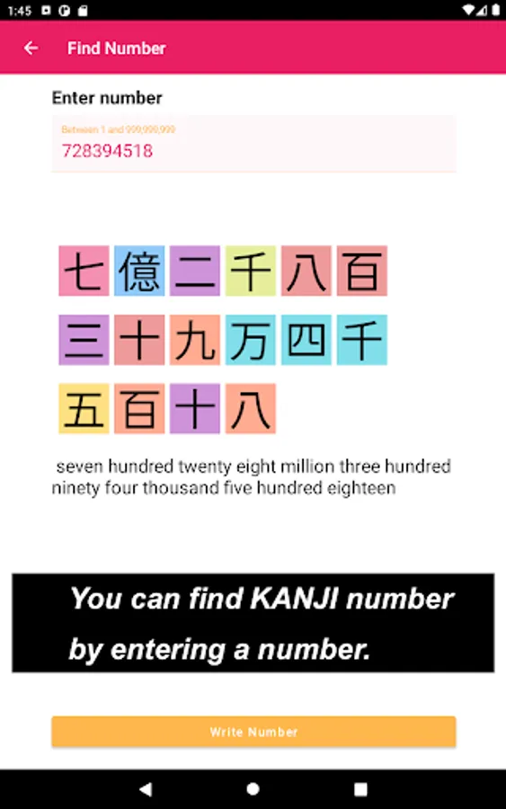 On the top, there is an area of entering number. As you see, you can input a number, between 1 and 999999999, you want to know how to write using KANJI letter. On the middle, there is an area of showing a number using KANJI letters as well as how to read in English, after entering the number on the top area. On the bottom, there is a Write Number button. As you imagine, if you tap the button, you are taken to the next page where you can practice KANJI number you have just entered on the previous page. I hope that you would get used to write any KANJI number as you use this page. Well, to begin with, why don't you enter a number, such as your age or your year of birth, to be able to write in KANJI number.