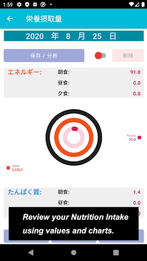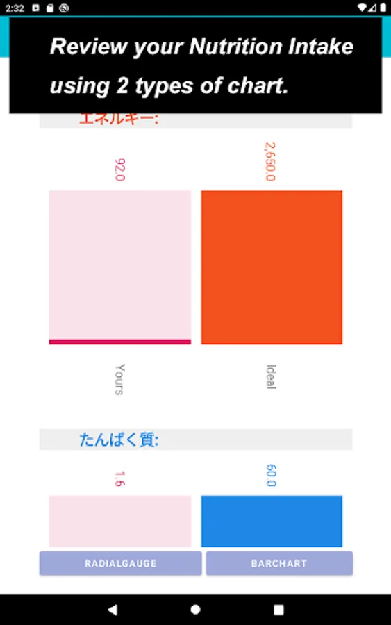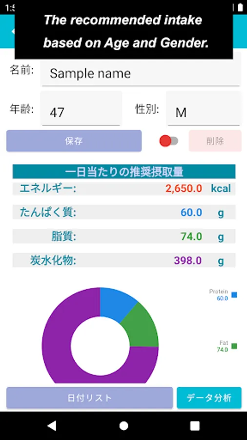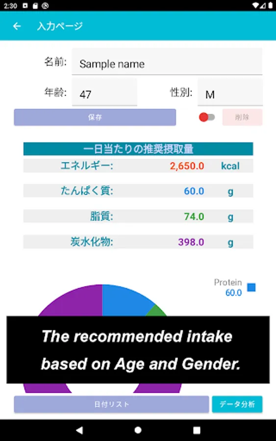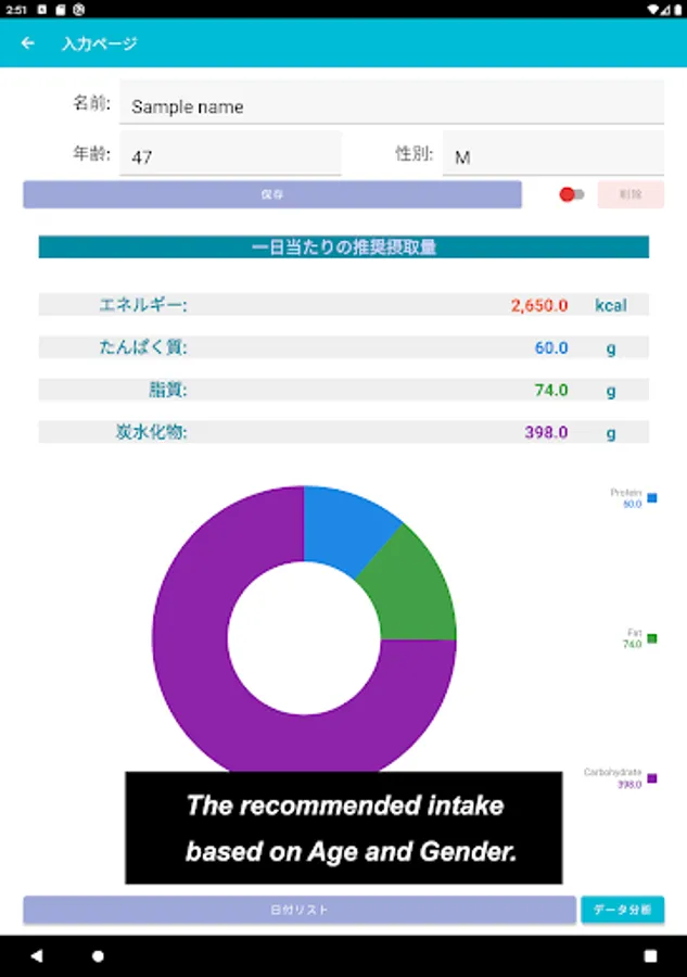 On the other part where you could make sure your ideal daily Nutrient intake, such as Energy / Protein / Fat / Carbohydrate, by putting your name, age and gender. For this ideal daily Nutrient intake, I have referred to [ Dietary Reference Intakes for Japanese ] drawn up by Ministry of Health, Labour and Welfare.
