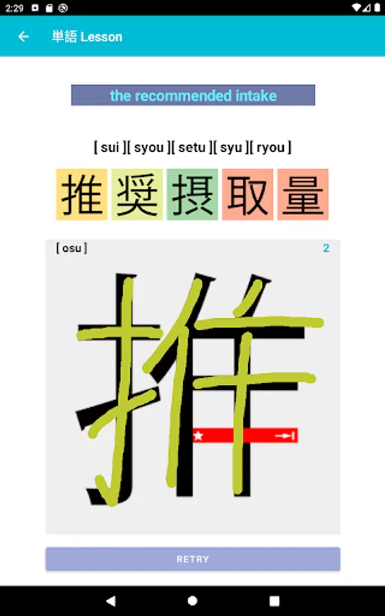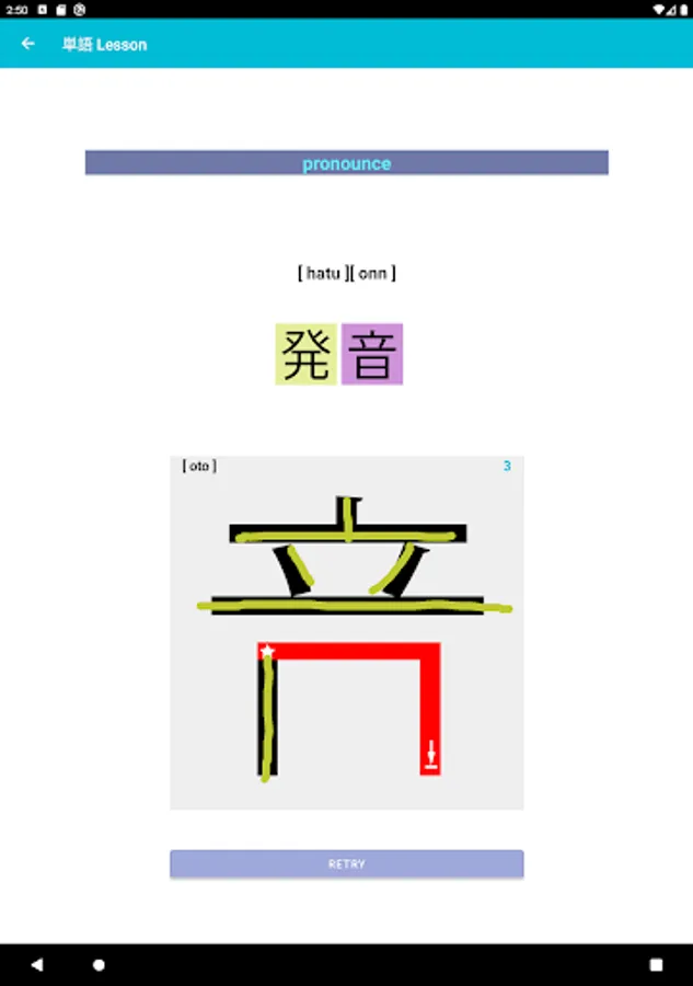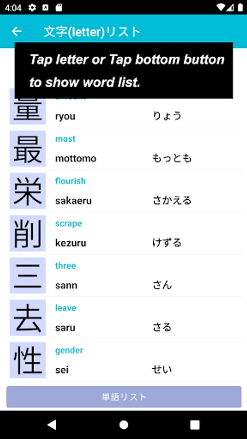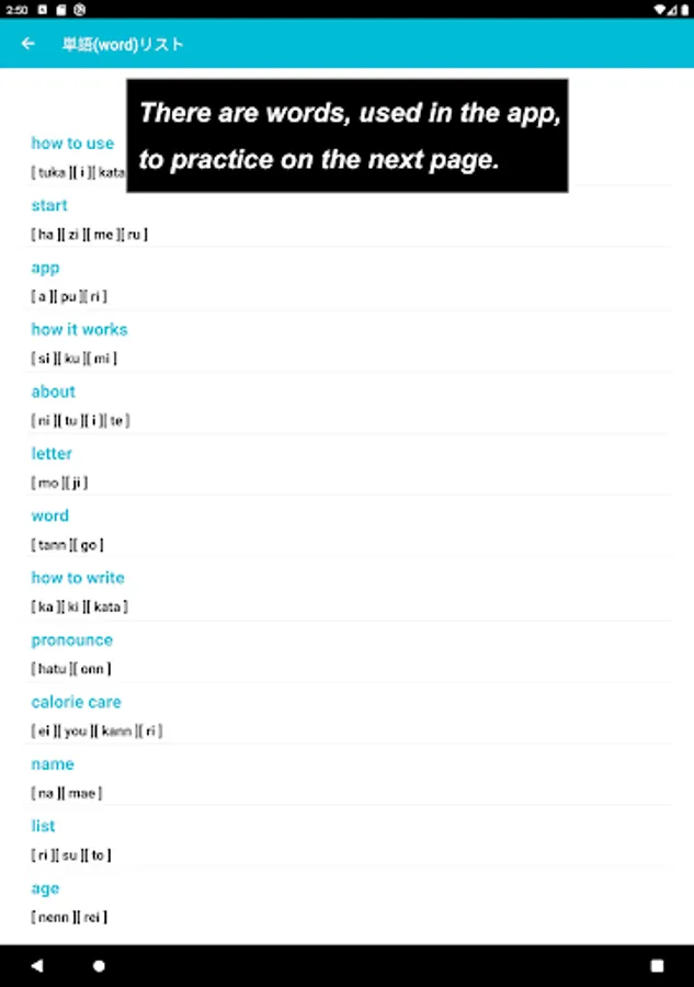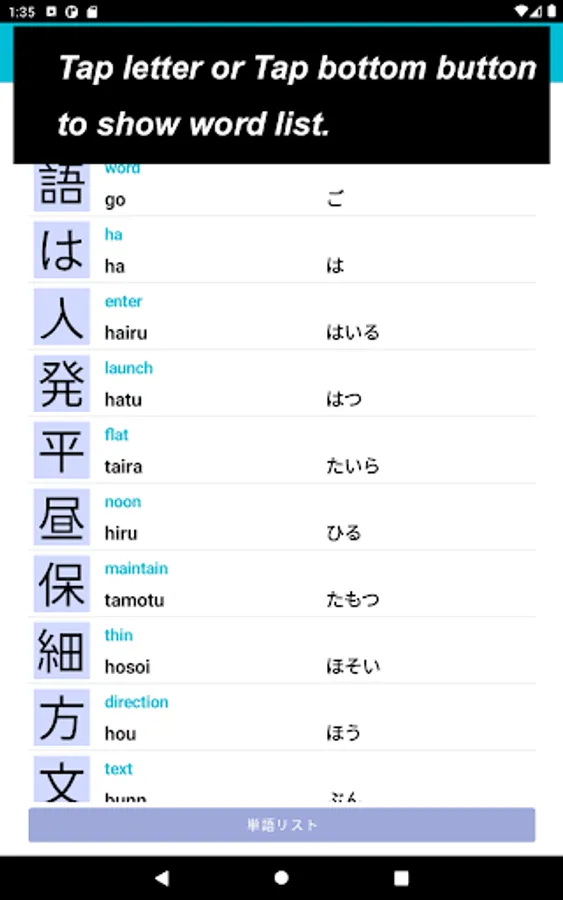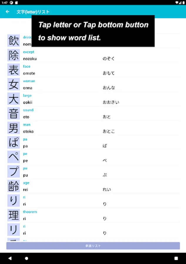 On the one part where you could practice Japanese letters, such as Hiragana / Katakana / Kanji, that used in this app.