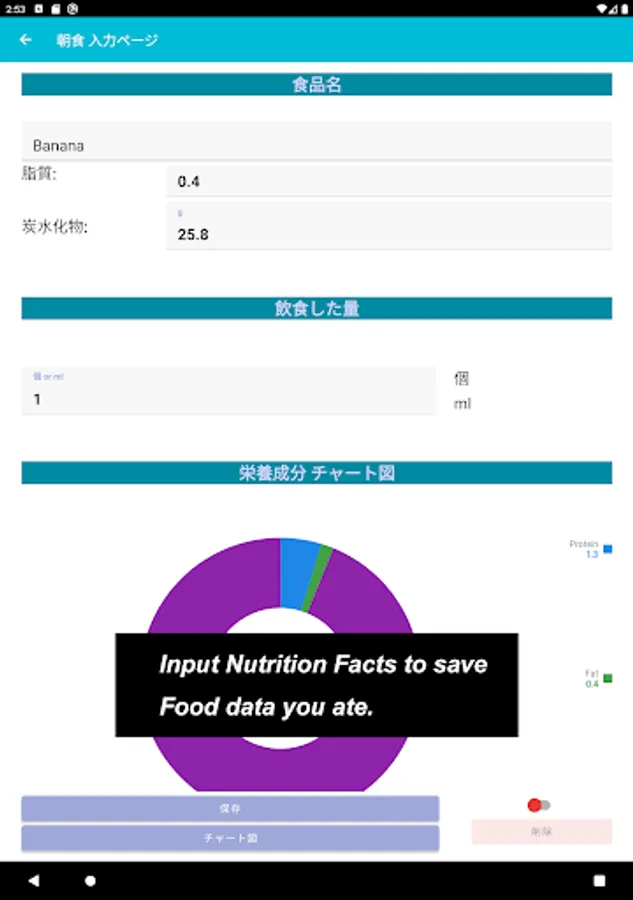 After that, you could start to record what you eat and drink along with some Information on Nutrition facts. These data are supposed to be saved on Breakfast page, Lunch page and Dinner page separately though; You could make sure daily Nutrient intake as well.