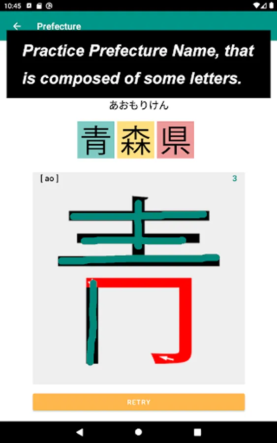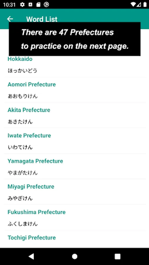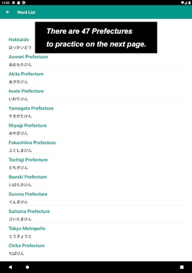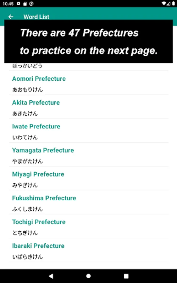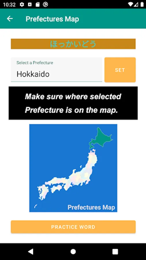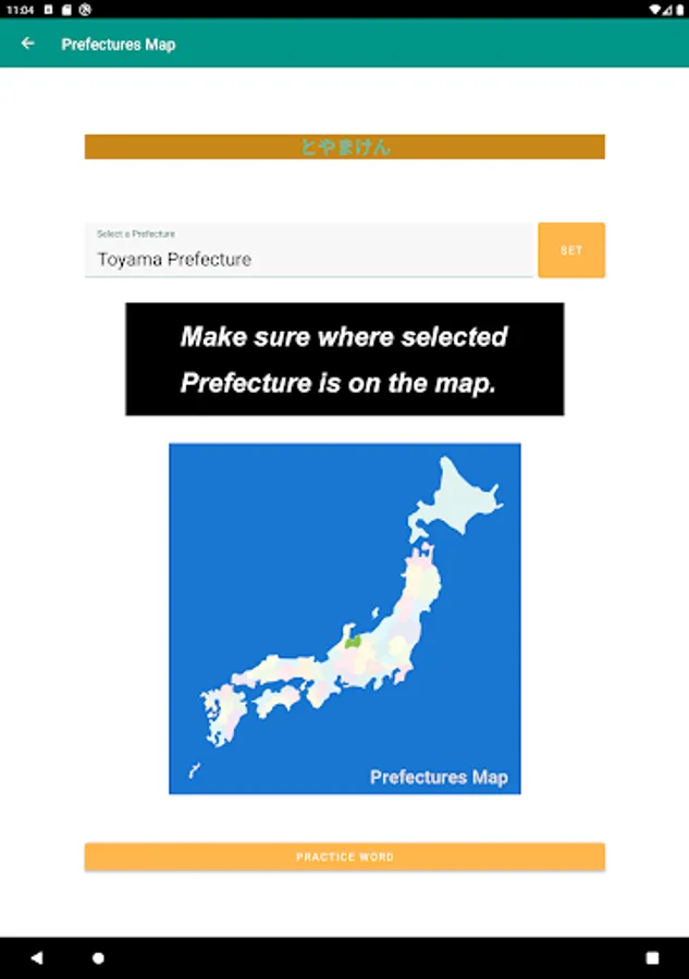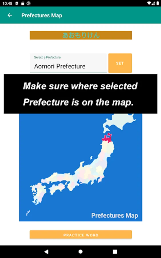 On the one part where you could practice Japanese letters, that used in the name of Prefecture in Japan. On the other part where you could make sure where it is on a simple map by selecting a prefecture you want to see.