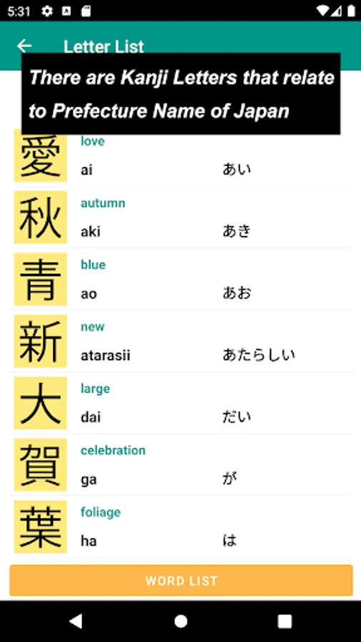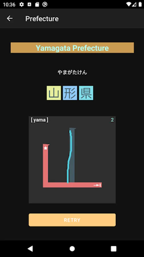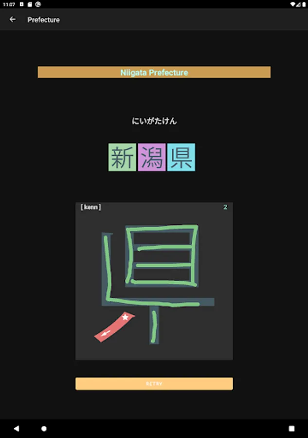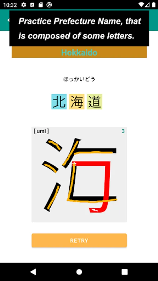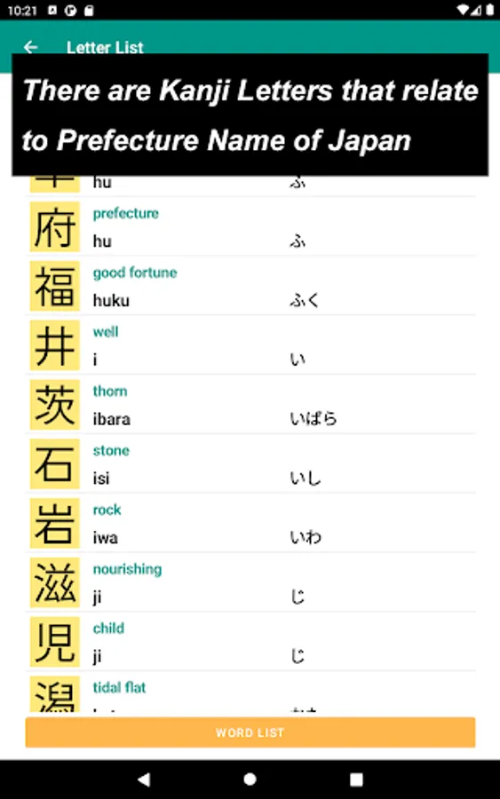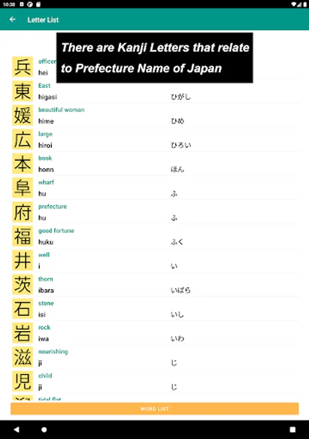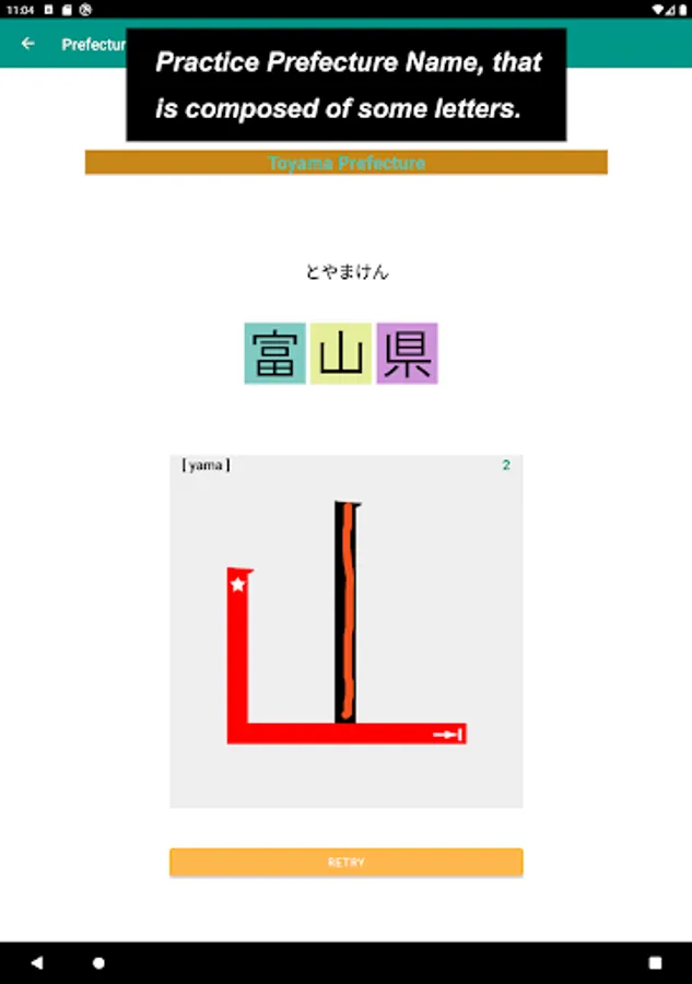 On the one part where you could practice Japanese letters, that used in the name of Prefecture in Japan. On the other part where you could make sure where it is on a simple map by selecting a prefecture you want to see.