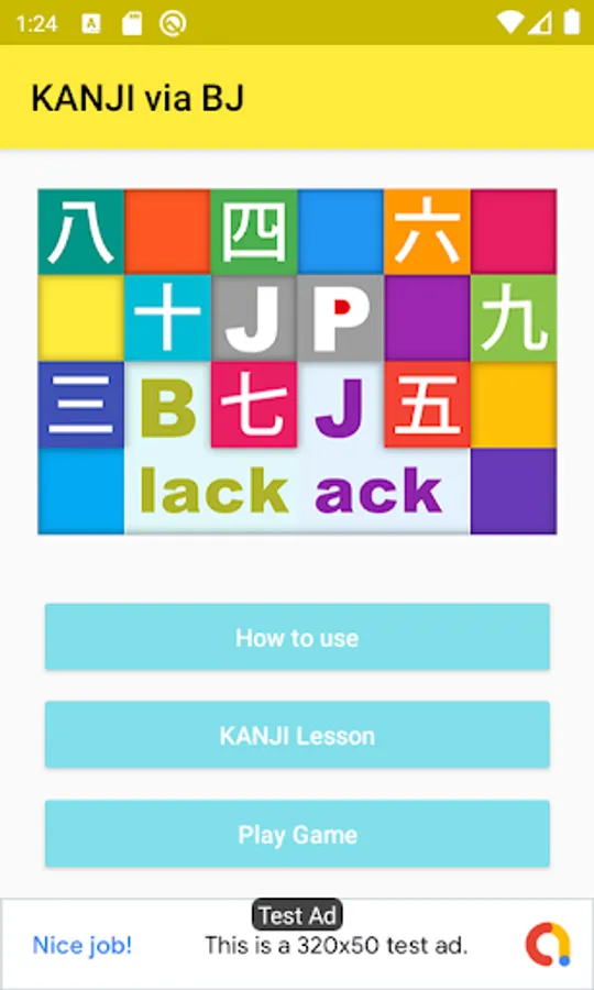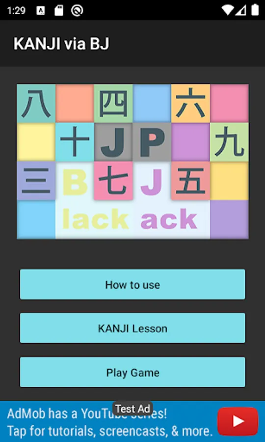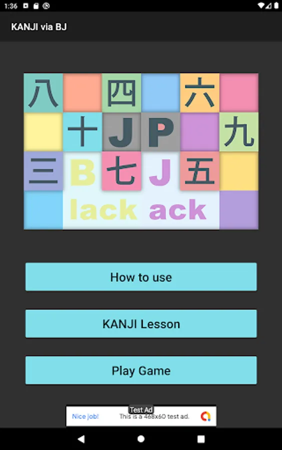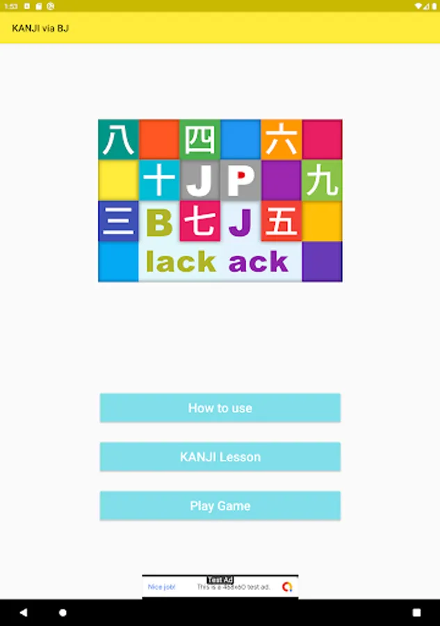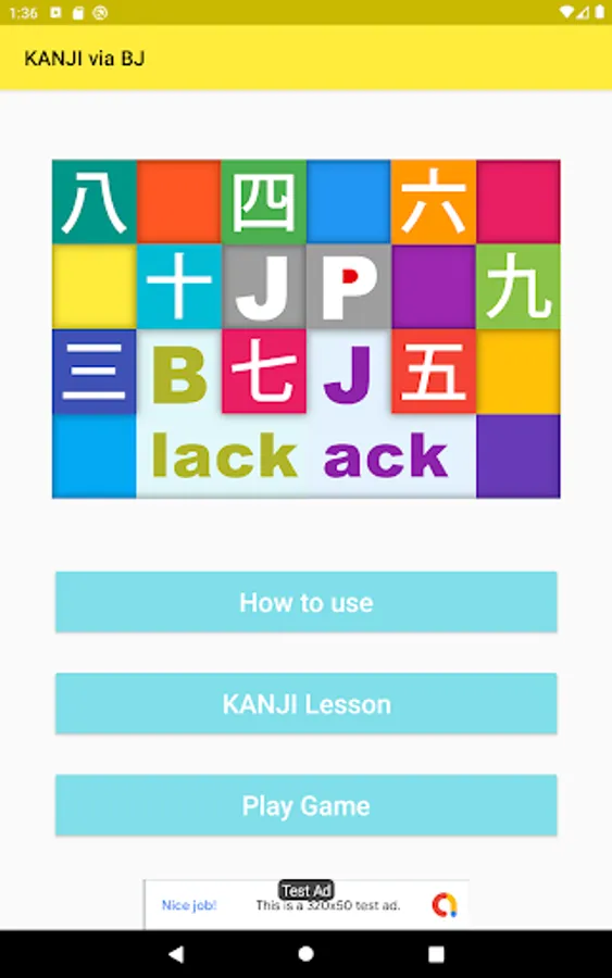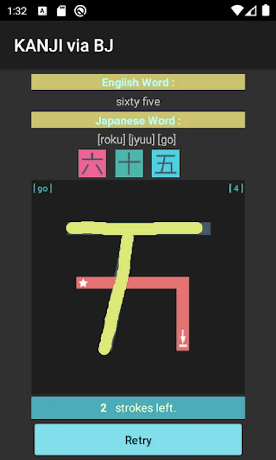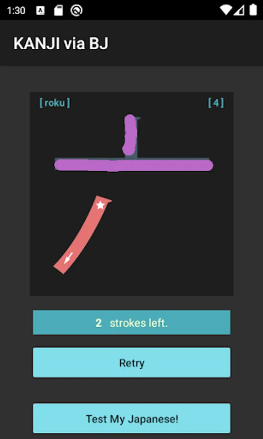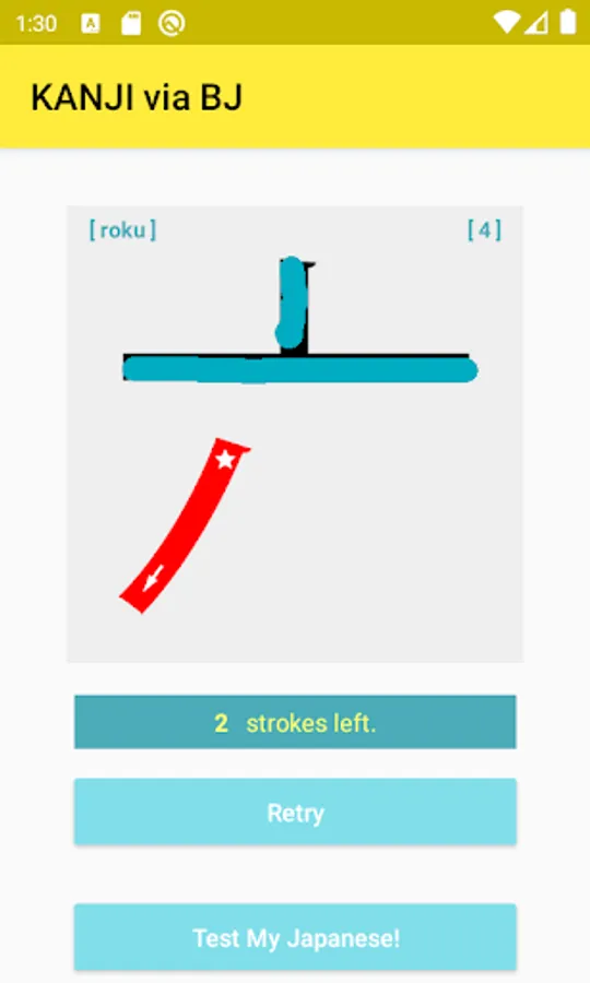 In the "KANJI Lesson" section, the first thing to be seen when you tap [KANJI Lesson] button is a List page where you can choose "KANJI Number letter". Each cell of this list page is composed of three sections, such as “Image of KANJI Number letter", "How to pronounce in Japanese" and "A meaning of the KANJI Number letter in English”. The second thing to be seen when you tap one of these "KANJI Number letter" is a practice page of "KANJI Number letter" you just pick up, where is composed of "How to pronounce in Japanese", "A drawing KANJI letter area", "A number of its KANJI stroke", [Retry] button and [Test My Japanese!] button. The stroke number is counted down to zero each time you draw lines following a red guidance line of KANJI letter shown on the drawing KANJI letter area.