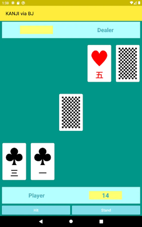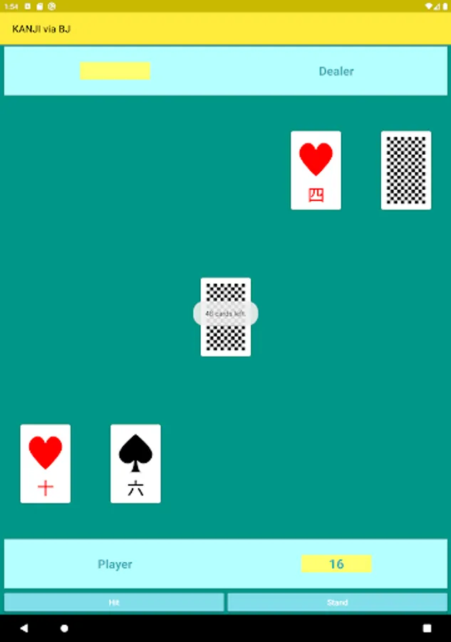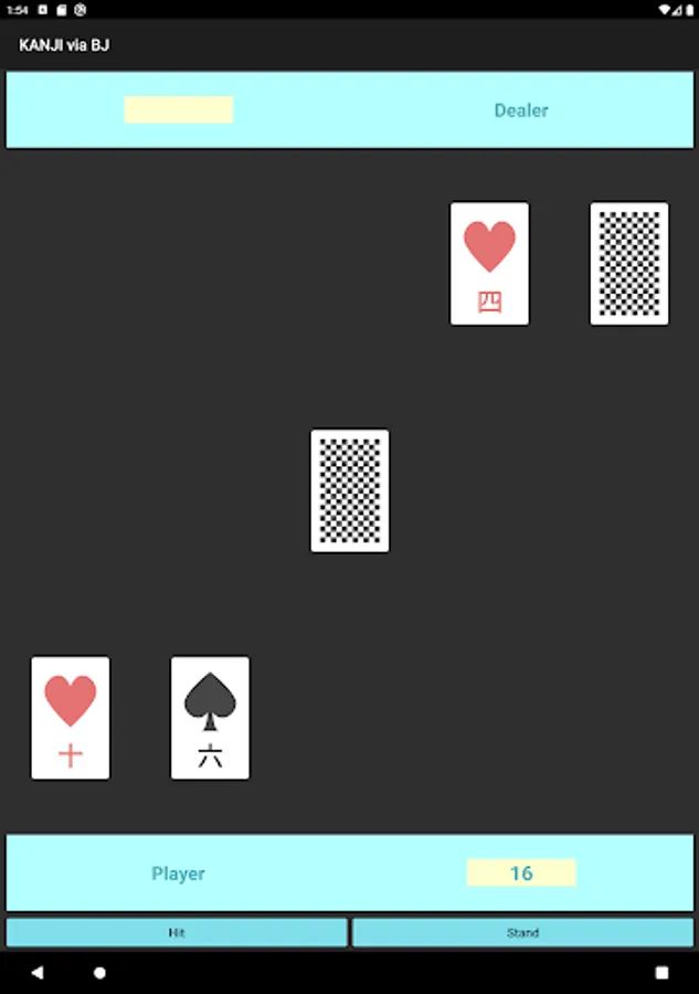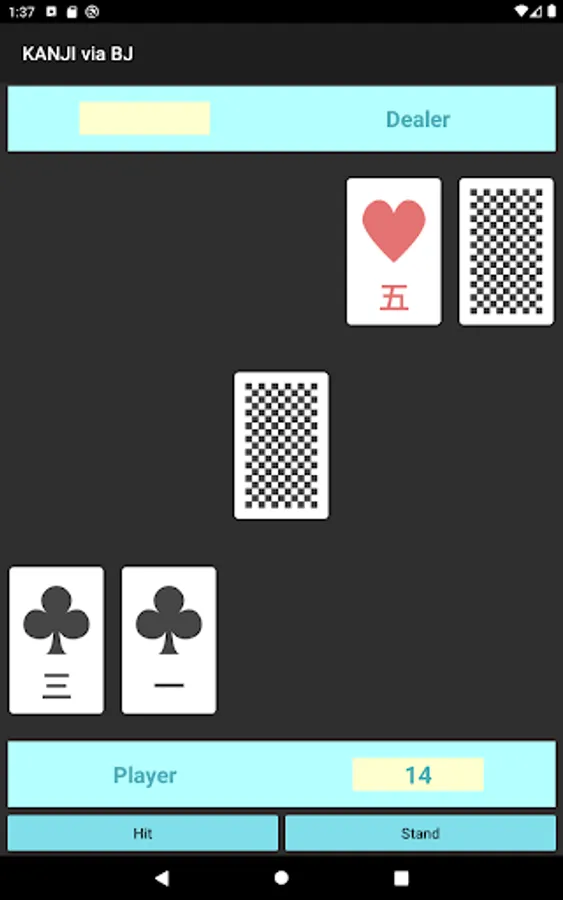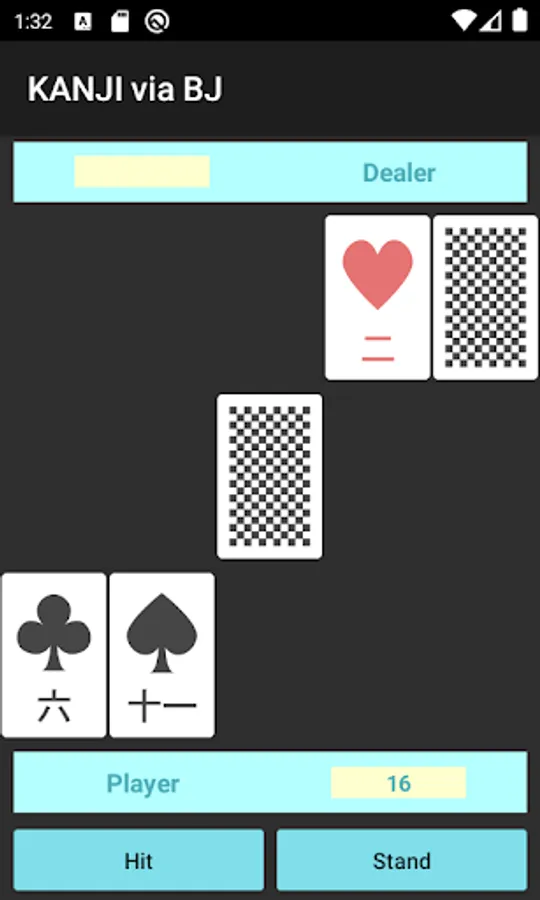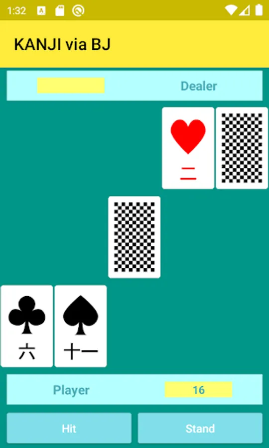 In the “Play Game” section, You are dealt with two cards that are face up. The dealer is also dealt with two cards, the one is face up and the another is face down. Then, you choose whether to take a card or end your turn, using [Hit] button to take one more card and [Stand] button to end your turn. In general, you choose which button you tap so that the hand value would not exceed 21 points. As you imagine, it is an ordinary game of Blackjack except for numbers on cards because all numbers are written in Kanji Number letters.