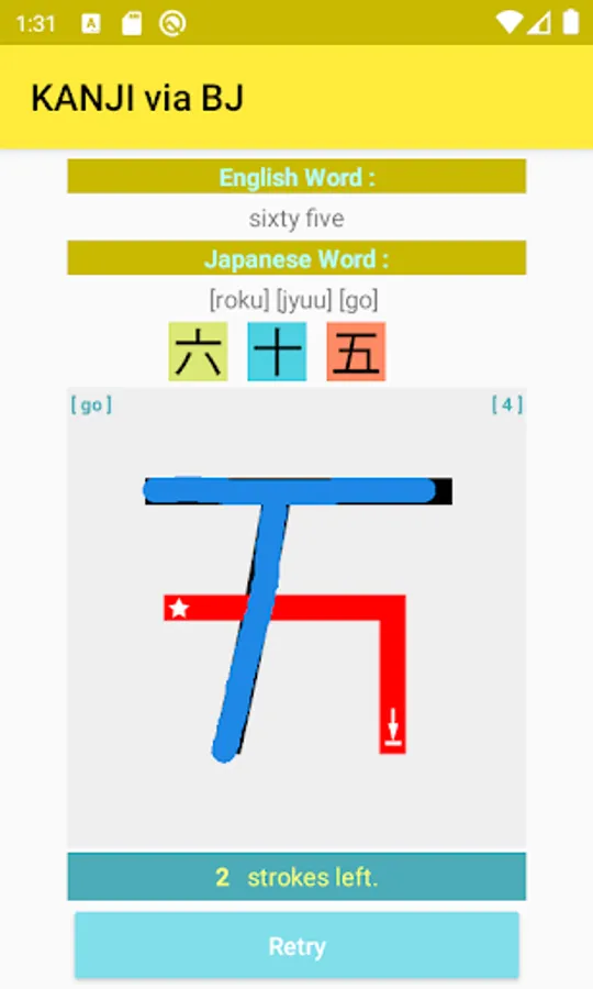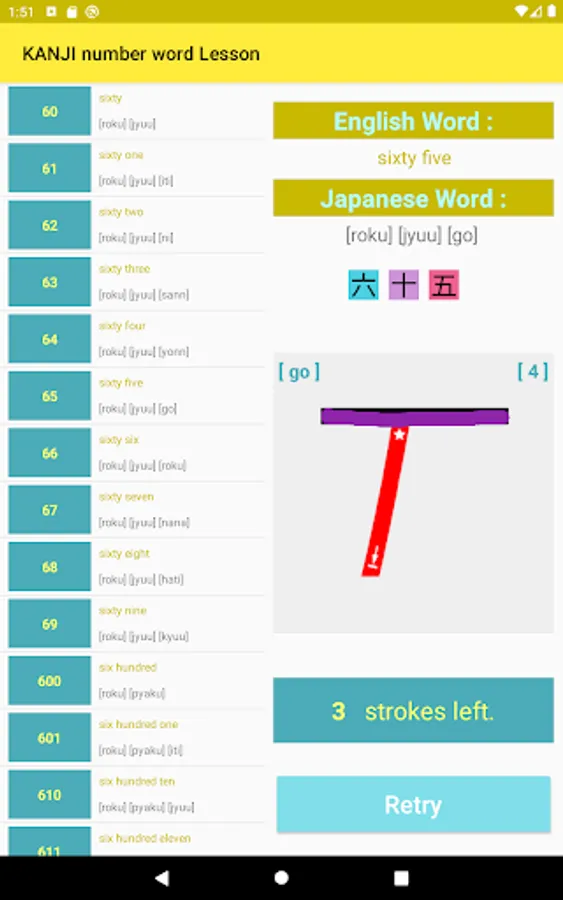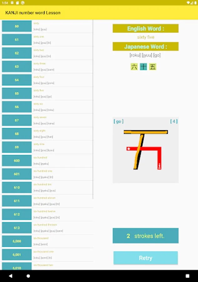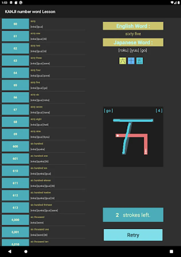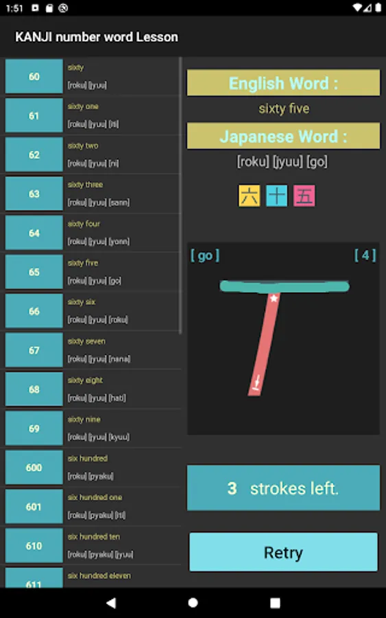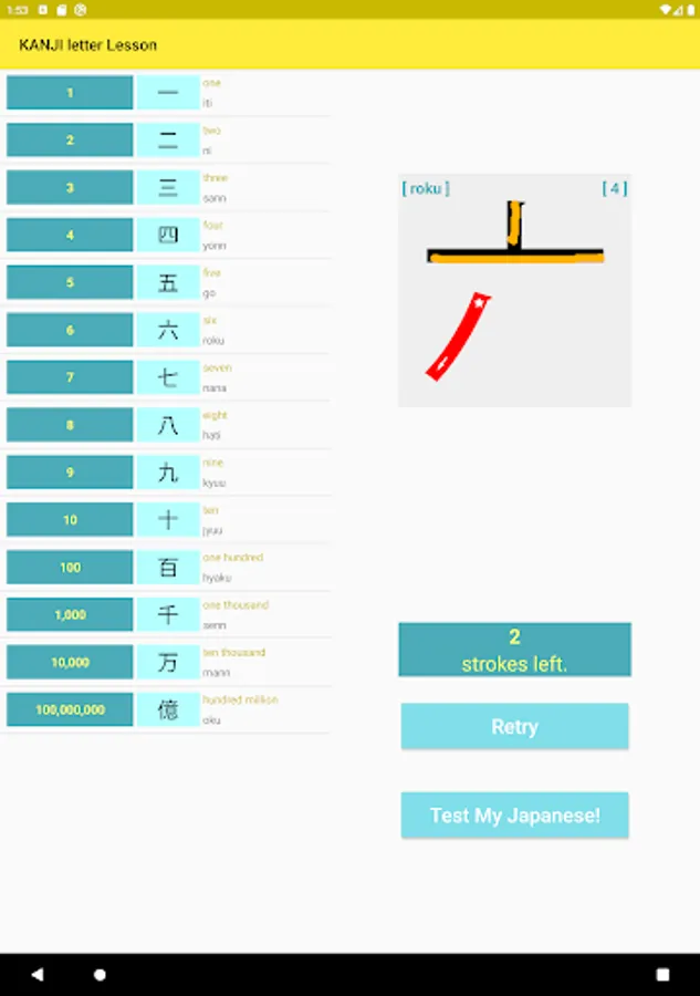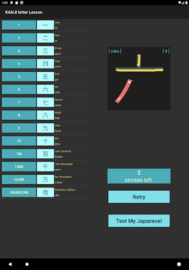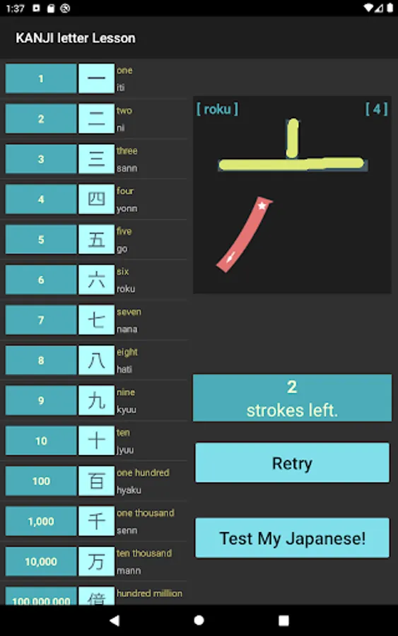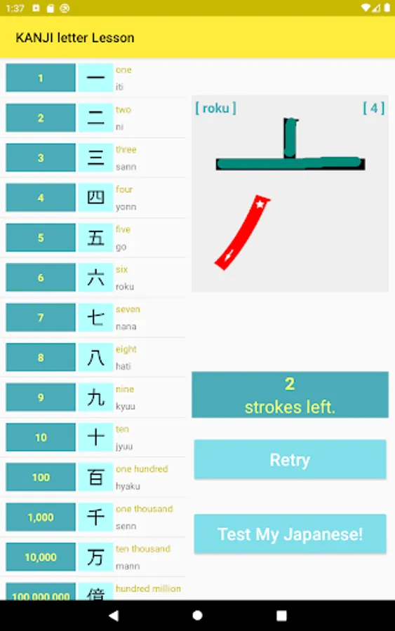 When you saw a list of Kanji numbers page in the app, you would notice to associate Kanji numbers from one to ten with English numbers from one to ten respectively though; there is not any Kanji numbers associating with eleven, for example. Then this app comes in to learn how to write it, such as if you wanted to write “eleven” in Kanji number letter, you should use two KANJI letters [ten] and [one], because you could describe eleven saying ten plus one.