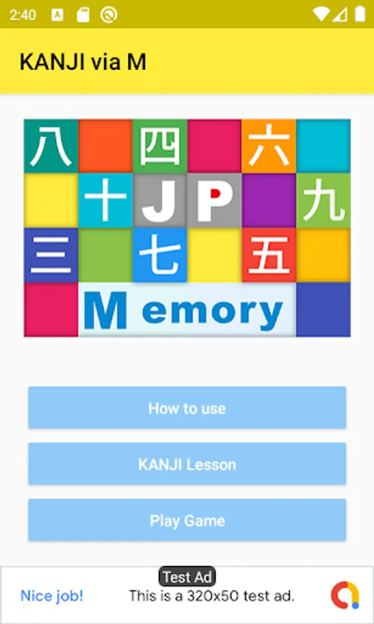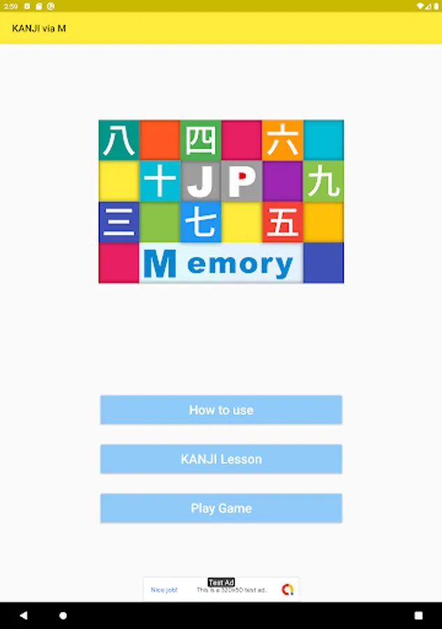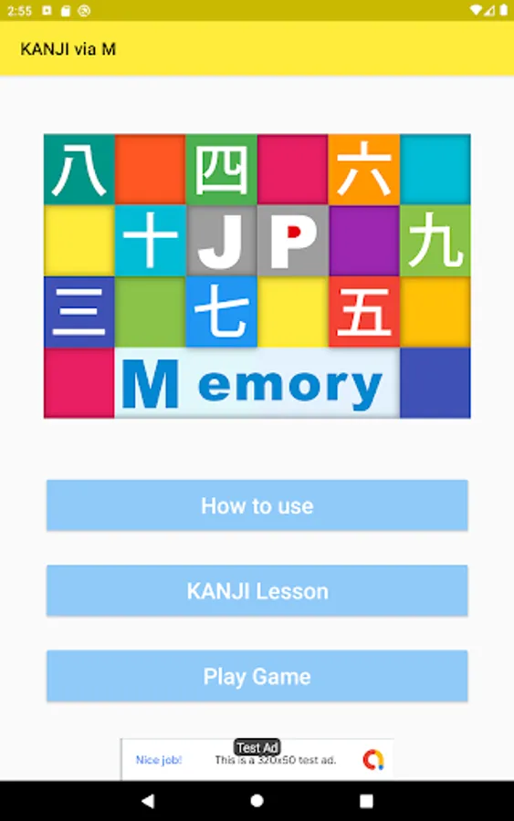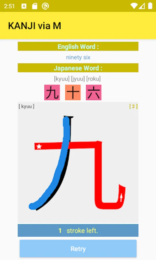 In the "KANJI Lesson" section, the first thing to be seen when you tap [KANJI Lesson] button is a List page where you can choose "KANJI Number letter". Each cell of this list page is composed of three sections, such as “Image of KANJI Number letter", "How to pronounce in Japanese" and "A meaning of the KANJI Number letter in English”. The second thing to be seen when you tap one of these "KANJI Number letter" is a practice page of "KANJI Number letter" you just pick up, where is composed of "How to pronounce in Japanese", "A drawing KANJI letter area", "A number of its KANJI stroke", [Retry] button and [Test My Japanese!] button. The stroke number is counted down to zero each time you draw lines following a red guidance line of KANJI letter shown on the drawing KANJI letter area.