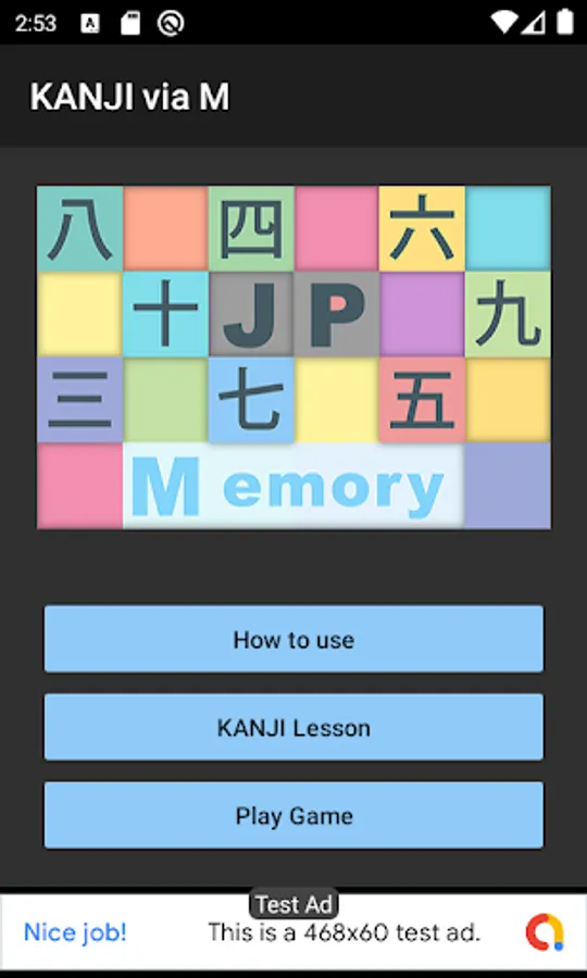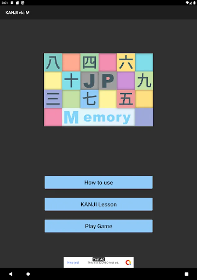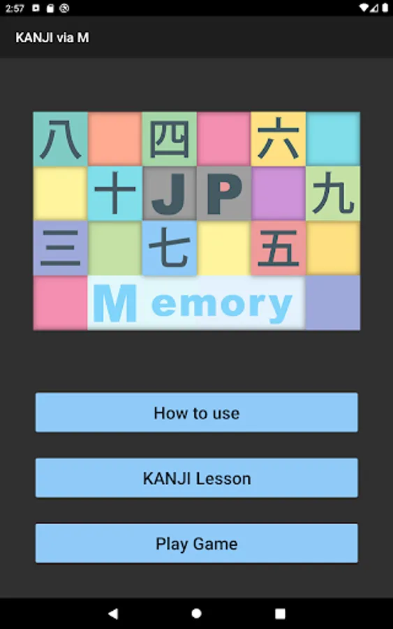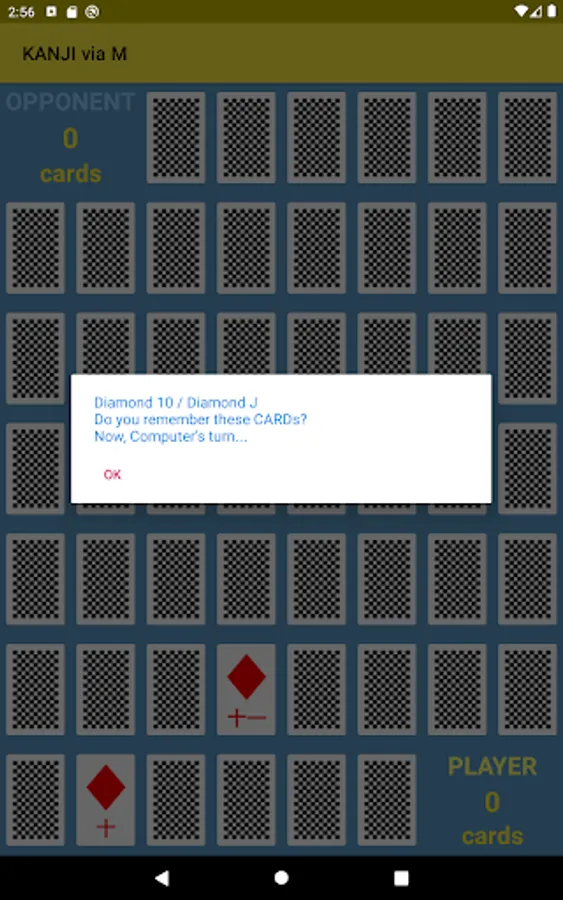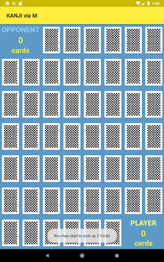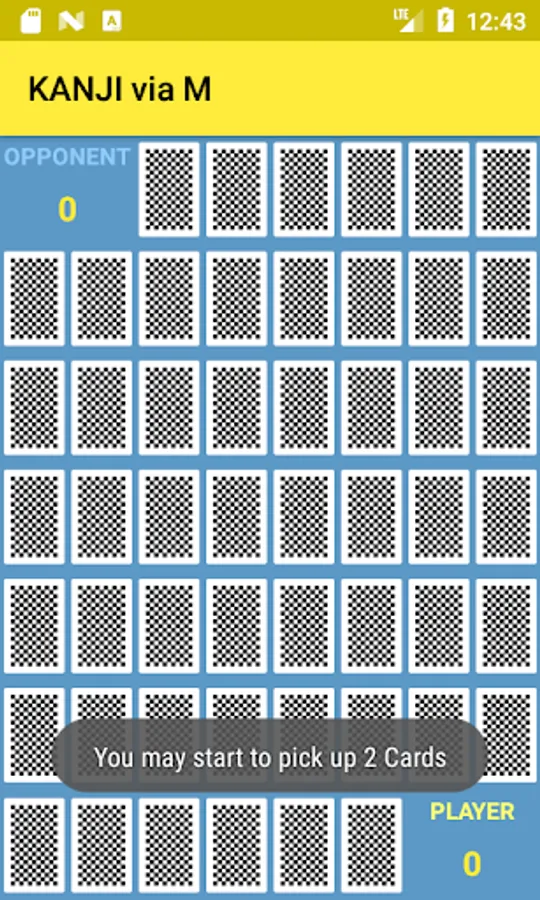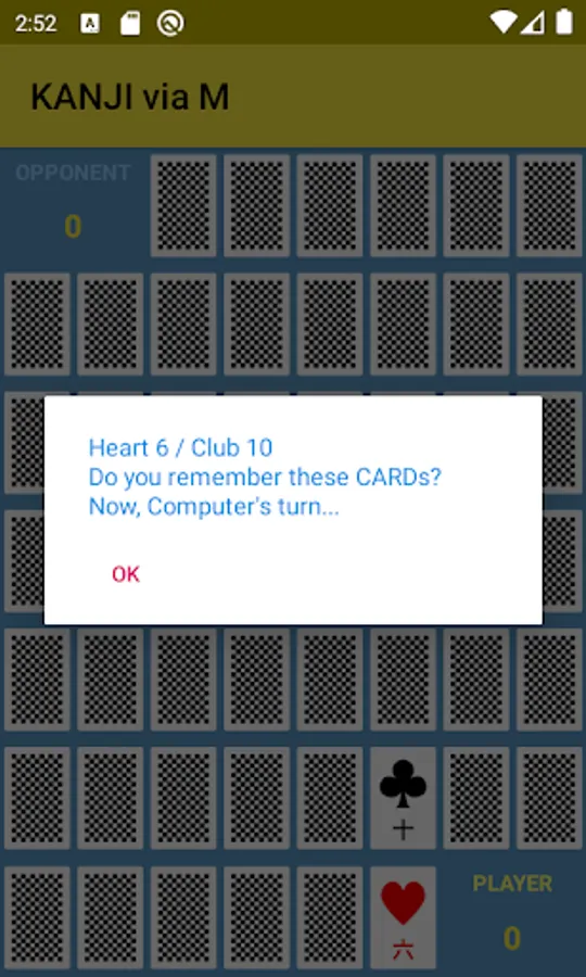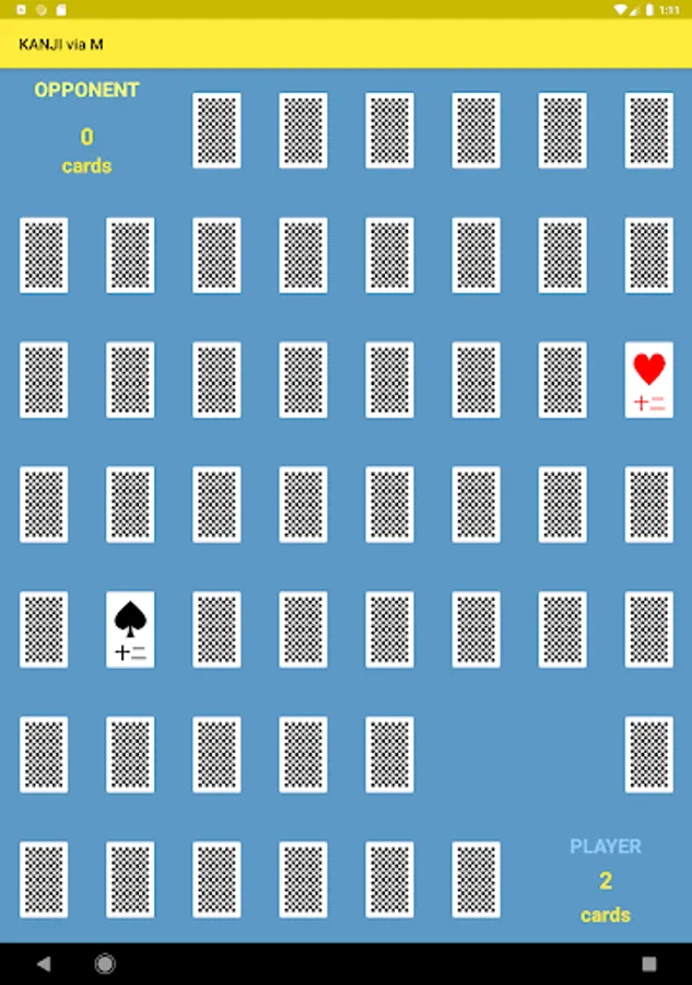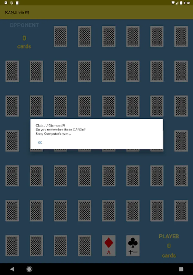In the “Play Game” section, All of the cards, on which numbers are written in Kanji letters, are laid face down. You choose two cards and turn them face up by tapping each card image. If both of them have same number, then you will win the cards, in other words you will get 2 points. And then, you can choose two cards again until two cards you pick up don’t have same number. If two cards you choose don’t have same number, these cards are turned face down and your opponent will start to turn cards face up. In general, the game ends when the last 2 cards are picked up. And the winner is the one who has the most cards, in other words the higher points.