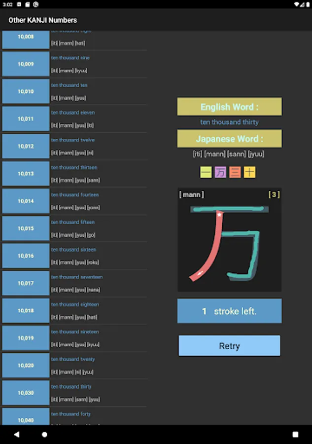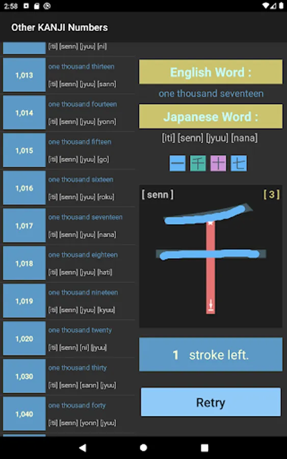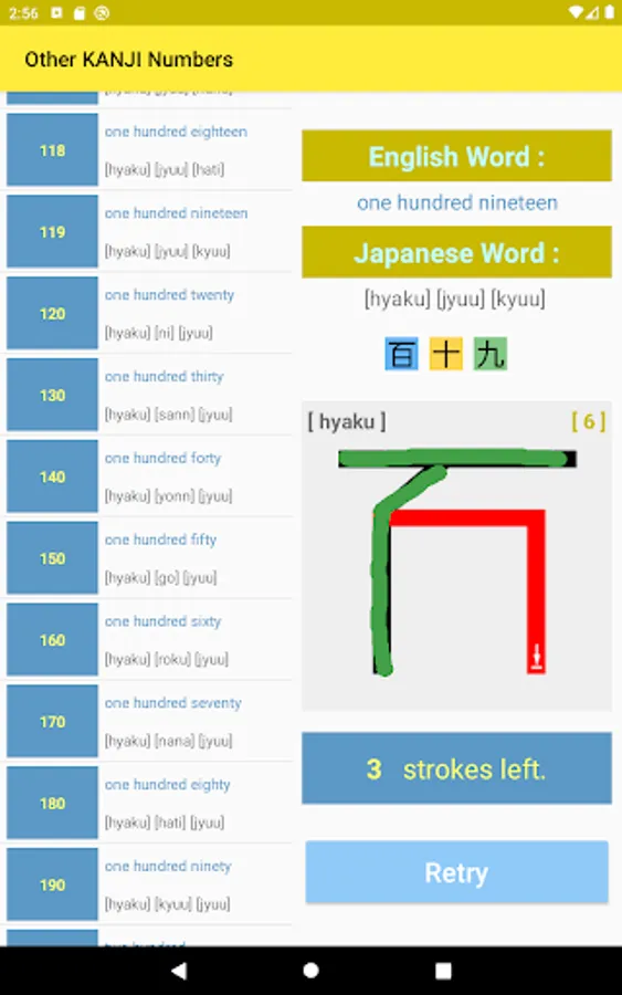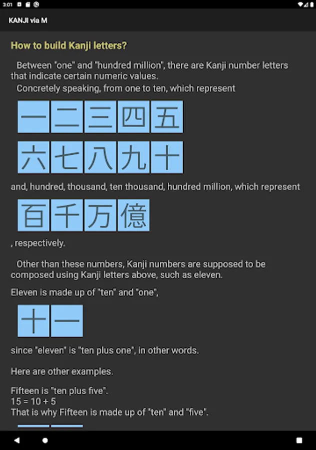 When you saw a list of Kanji numbers page in the app, you would notice to associate Kanji numbers from one to ten with English numbers from one to ten respectively though; there is not any Kanji numbers associating with eleven, for example. Then this app comes in to learn how to write it, such as if you wanted to write “eleven” in Kanji number letter, you should use two KANJI letters [ten] and [one], because you could describe eleven saying ten plus one.