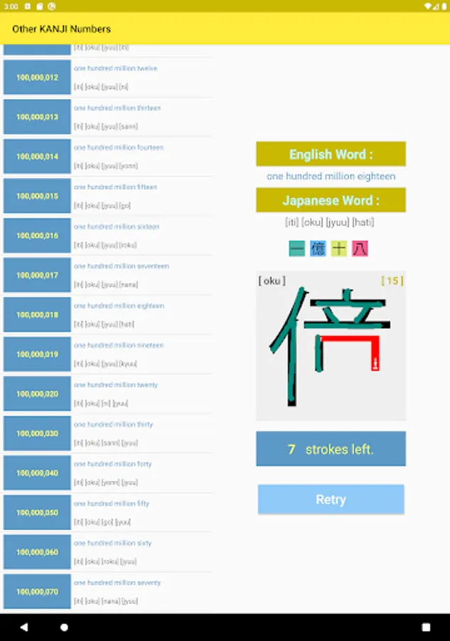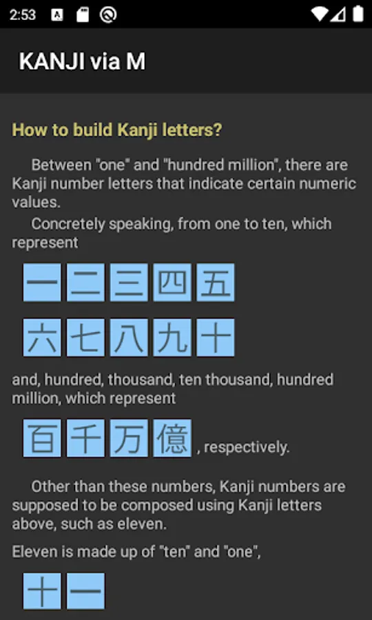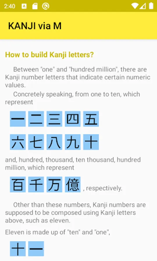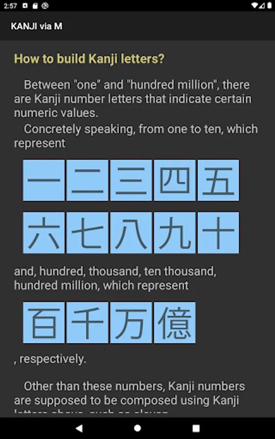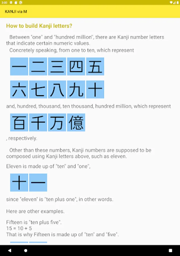 The app covers some letters of KANJI number, such as [one] to [ten], [hundred], [thousand], [ten thousand], [hundred thousand], which are basic Kanji numbers, and shows how to read and write.