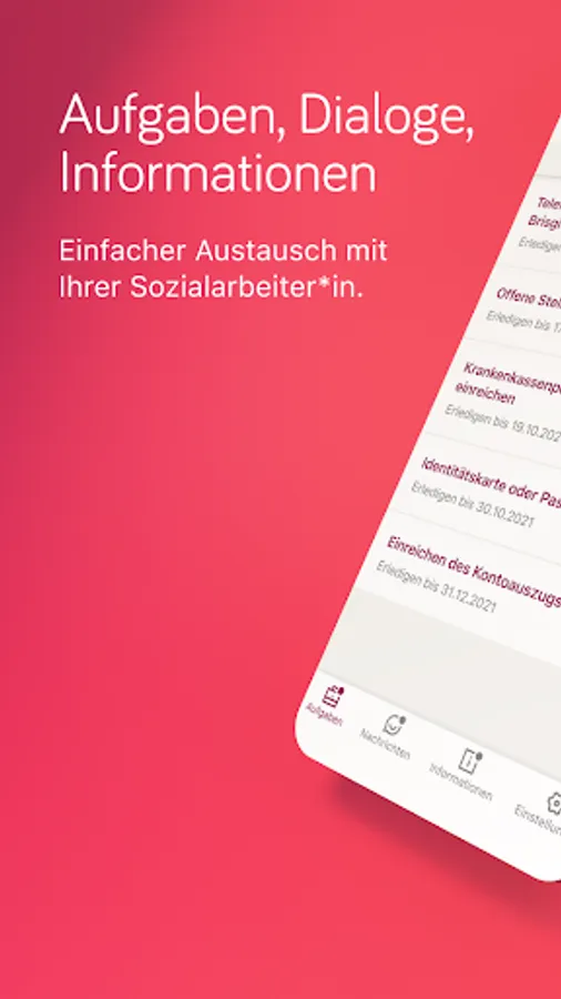You receive tasks from your social workers via the Bontrebo app. If documents are required, you have the option of scanning and submitting them directly in the app. If you feel unsure about the task, you can also ask questions right away. You also have the option of using the app to conduct dialogues with your responsible social worker, which can be initiated by both sides. You will also receive timely important information from your social welfare office via the app.